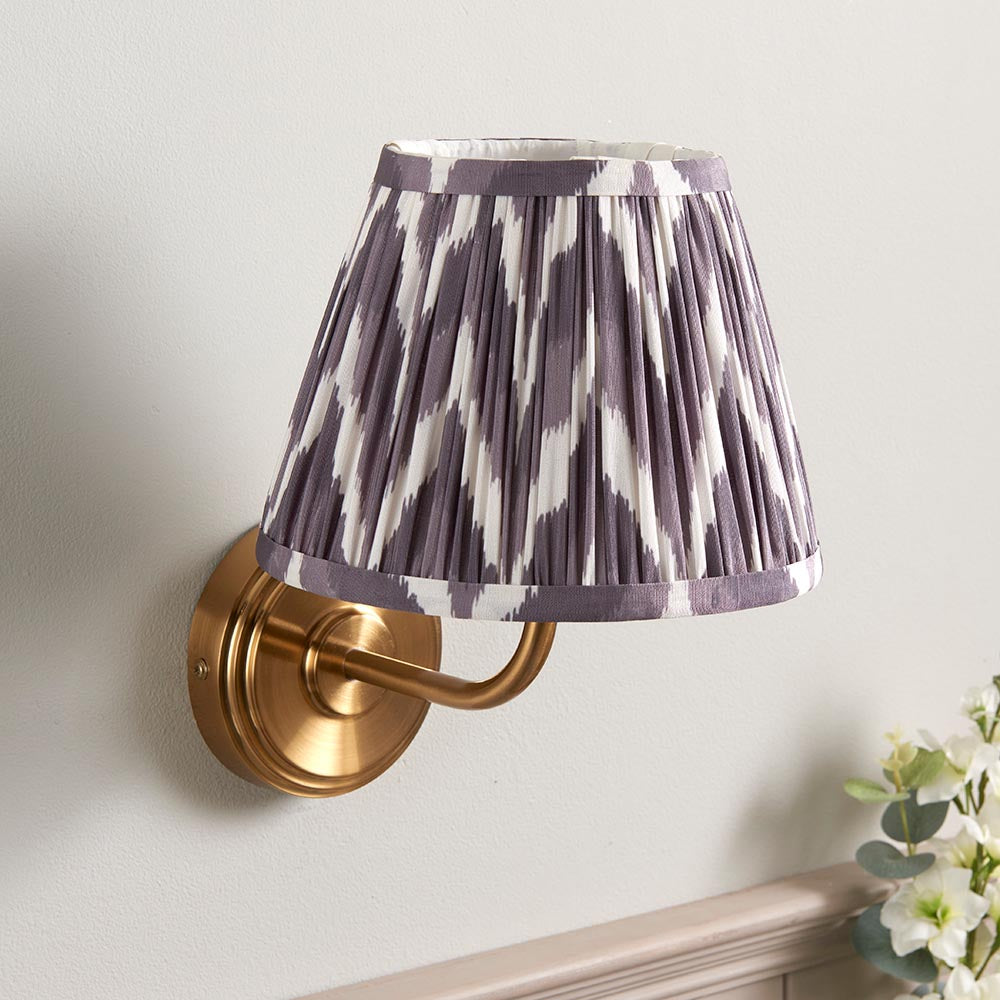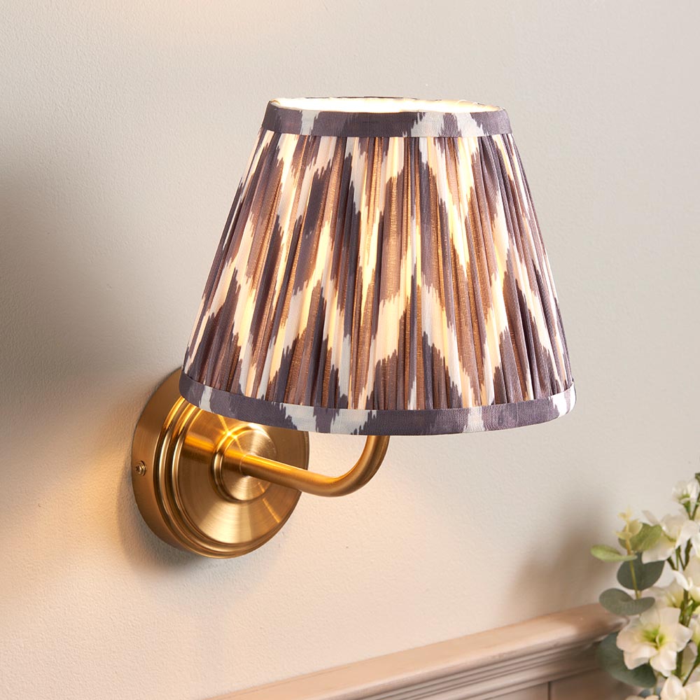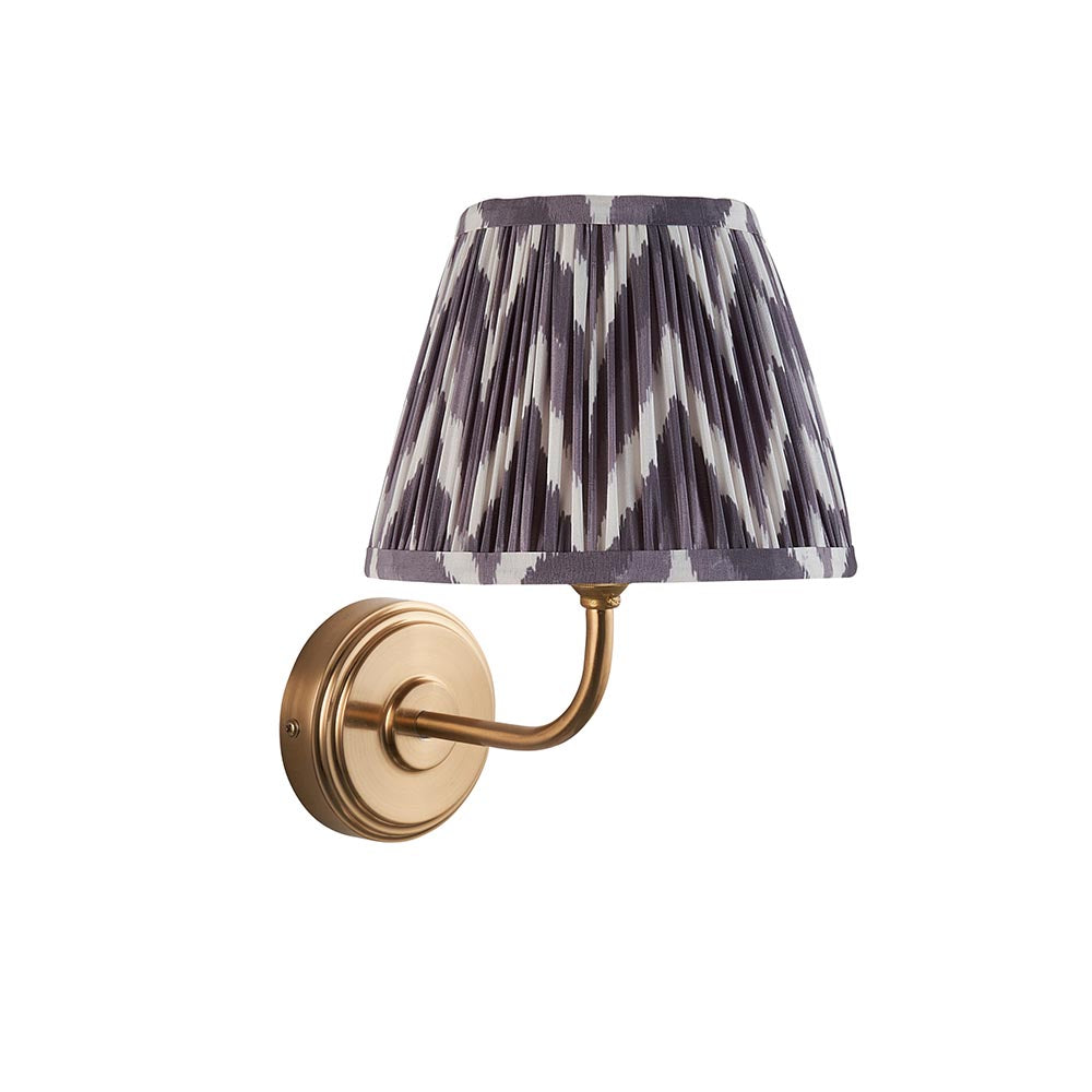 A classic stepped wall light with a simple curve arm, finished in brushed aged brass. This classic look is completed with our stylish pearl grey 20cm Zigzag shade.