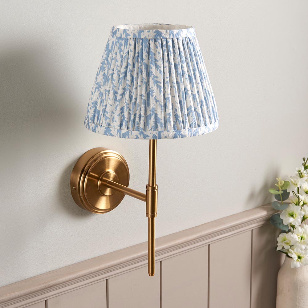 A classic stepped wall light with an understated T shape arm. Perfect for many areas of your home, finished in brushed aged brass. Paired with our subtle shell bay blue 20cm Leaf shade for a classic look.
