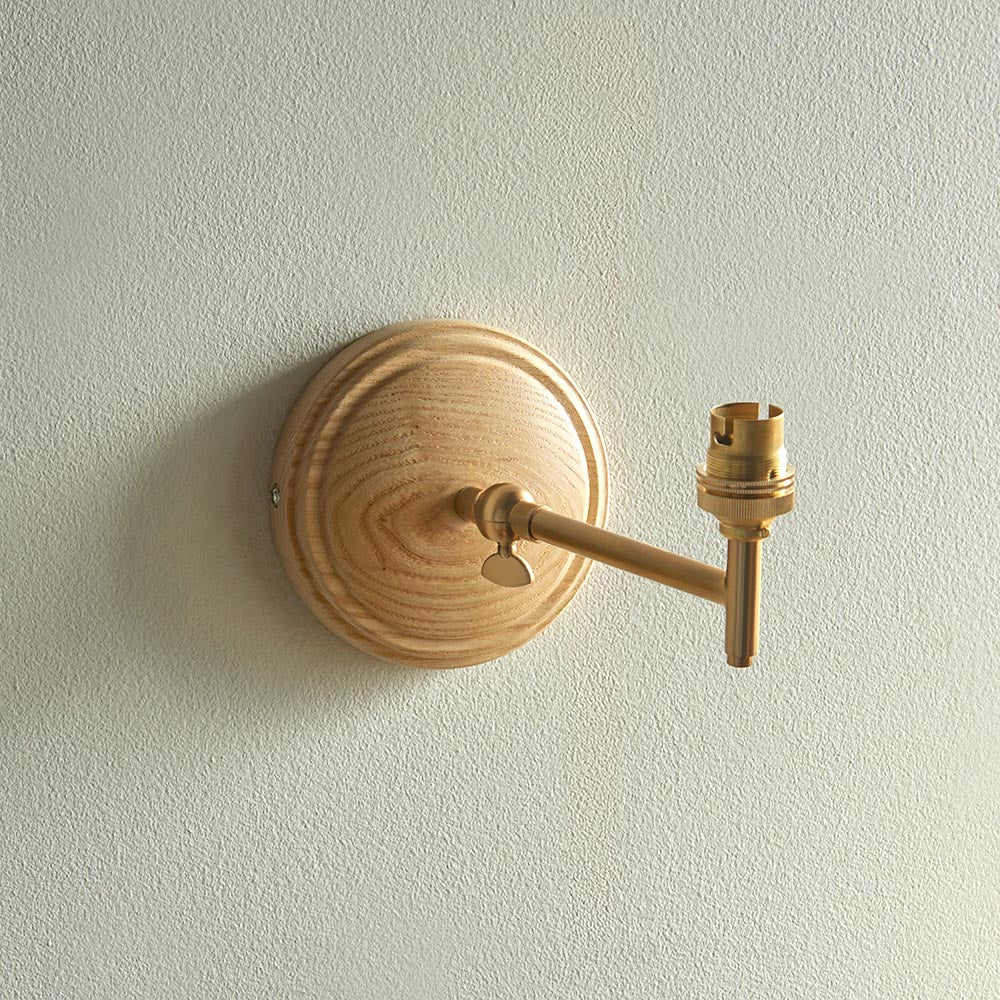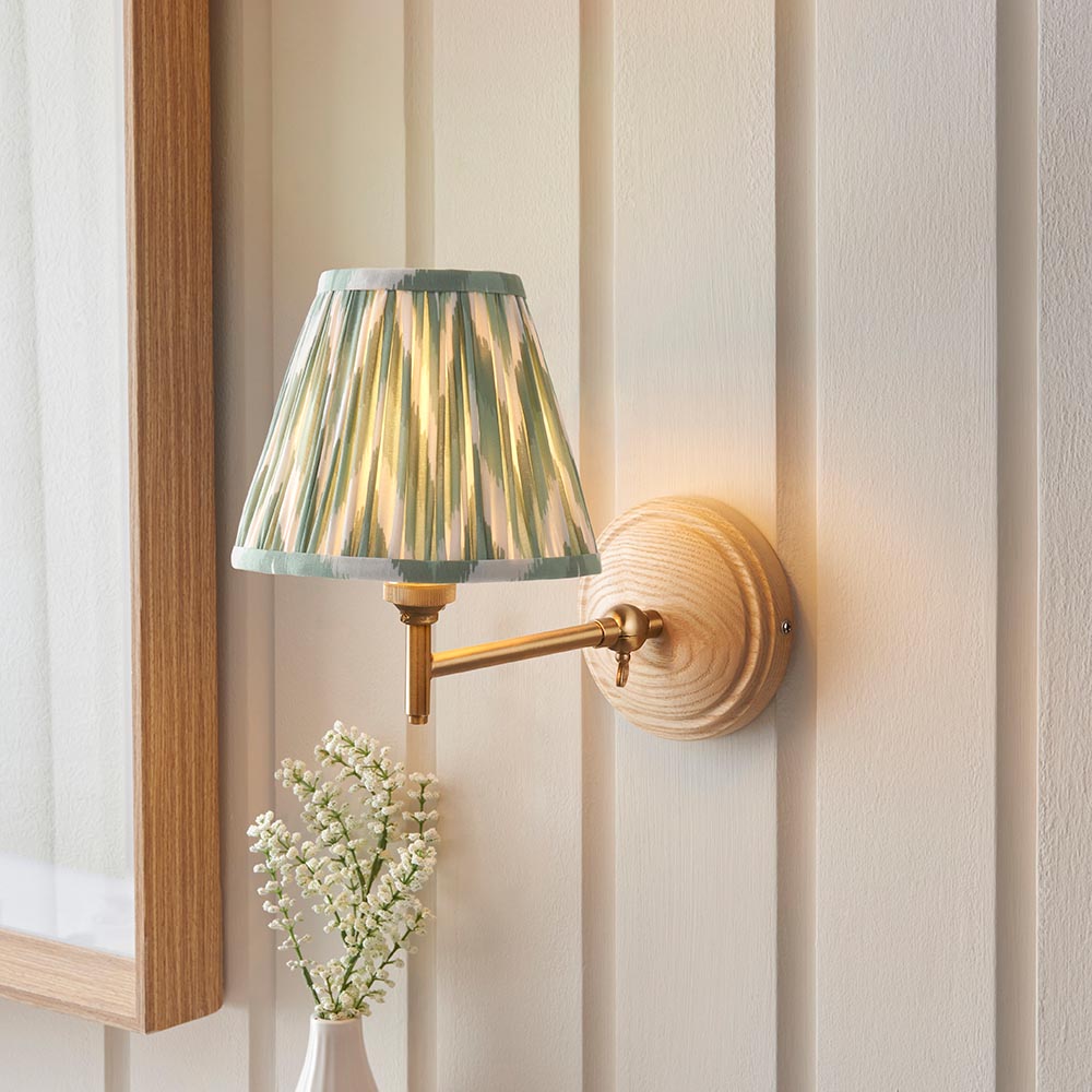 A natural Ash wood wall back with simple linear arm, featuring an adjustable knuckle to fold and reposition the light; perfect for bedsides, finished in brushed aged brass. Paired with our bold Cotswold green 16cm Zigzag shade for a classic look.