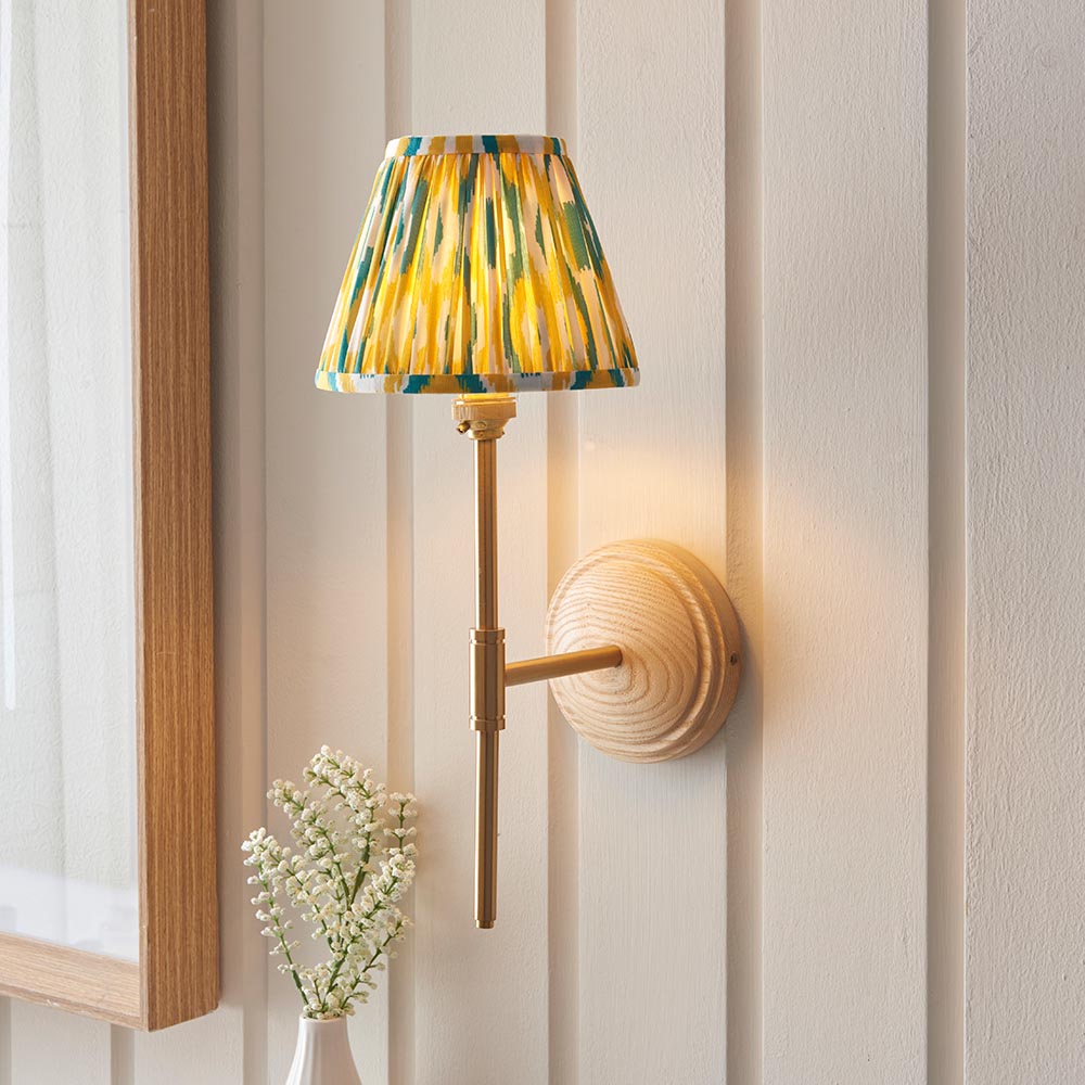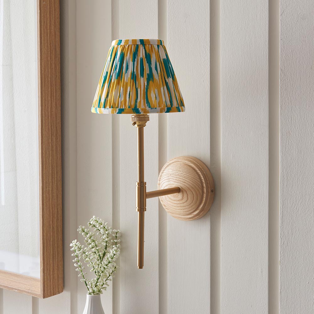 A natural Ash wood wall back with understated T shape arm. Perfect for many areas of your home, finished in brushed aged brass; paired with our vibrant yellow & jade 16cm Ikat shade.