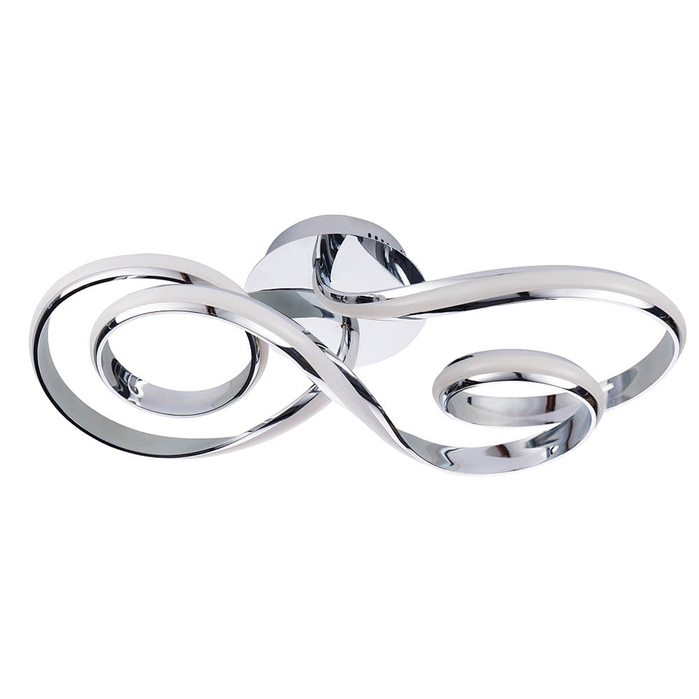 A unique contemporary ceiling light with flowing illuminated curves, creating an amazing designer look for modern interiors. Chrome plated finish with white diffuser and Integrated LED.