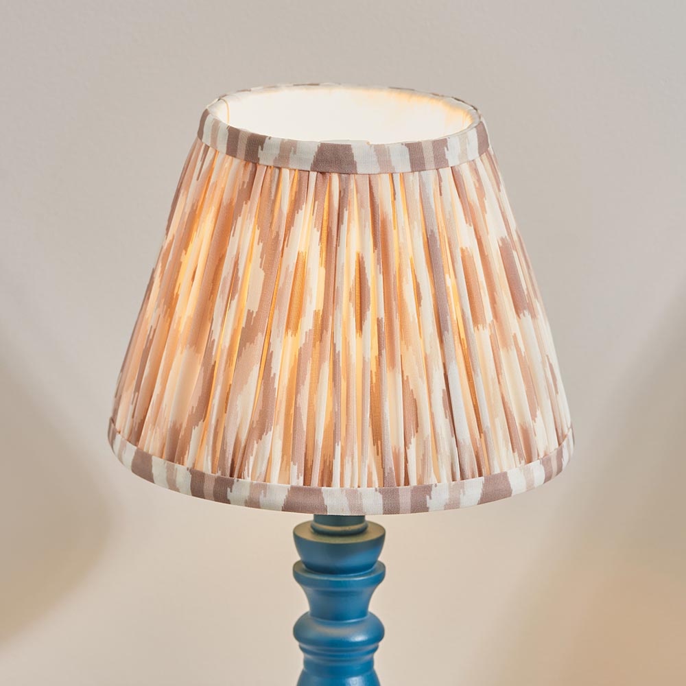 A beautiful wooden turned spindle light, painted in satin marlin blue. Perfect for classic interiors, featuring a brass B22 switched lamp holder and grey braided fabric flex. Paired with our natural 20cm Ikat shade for a unique, classic look.