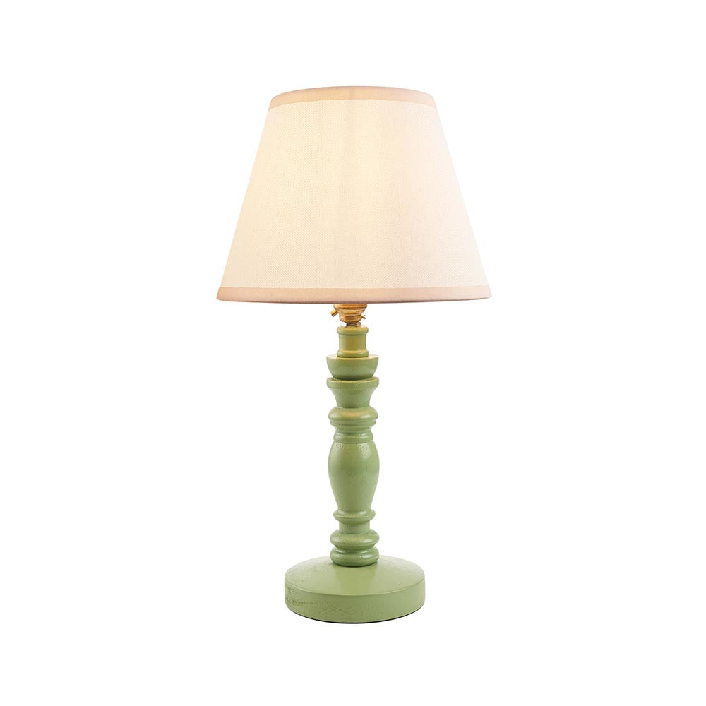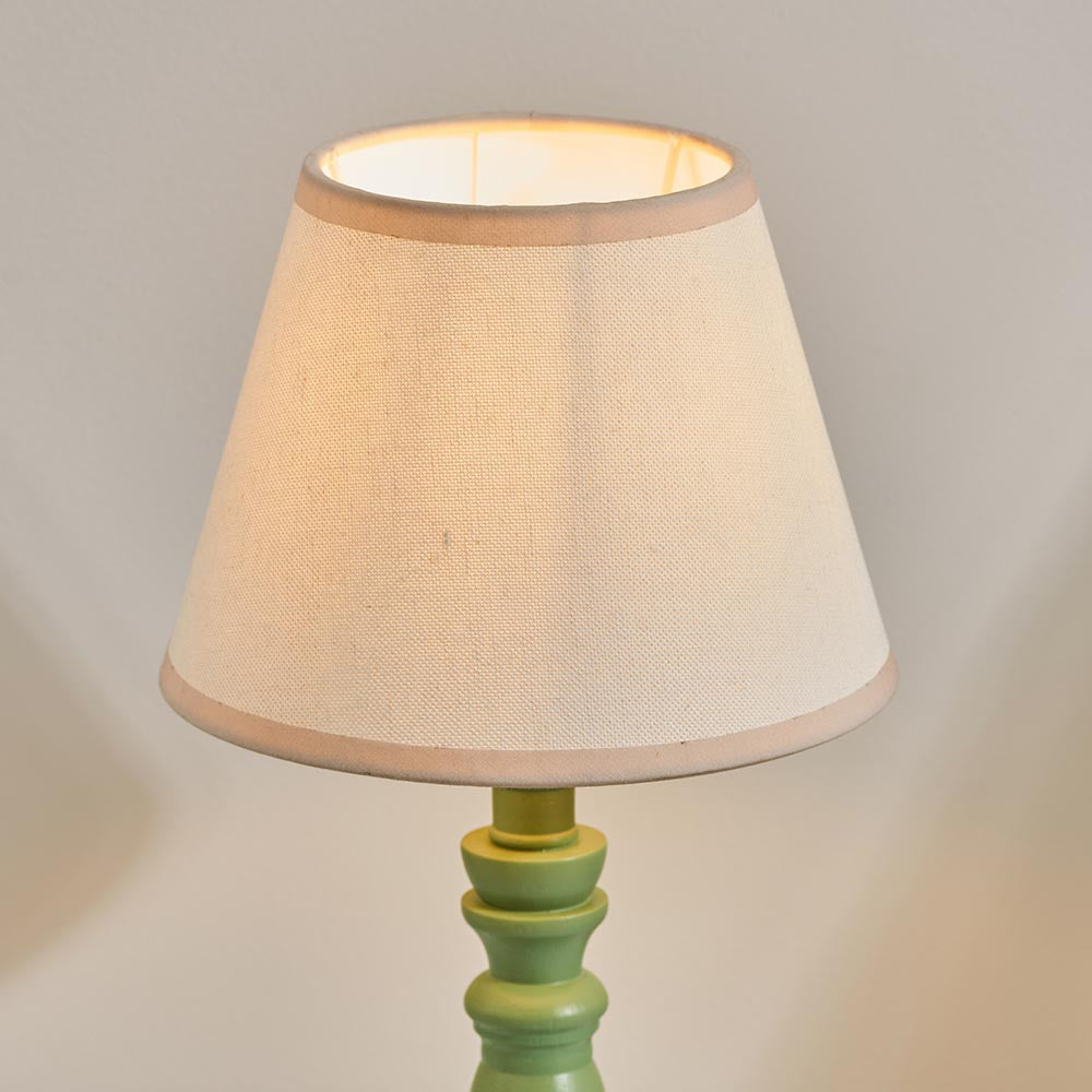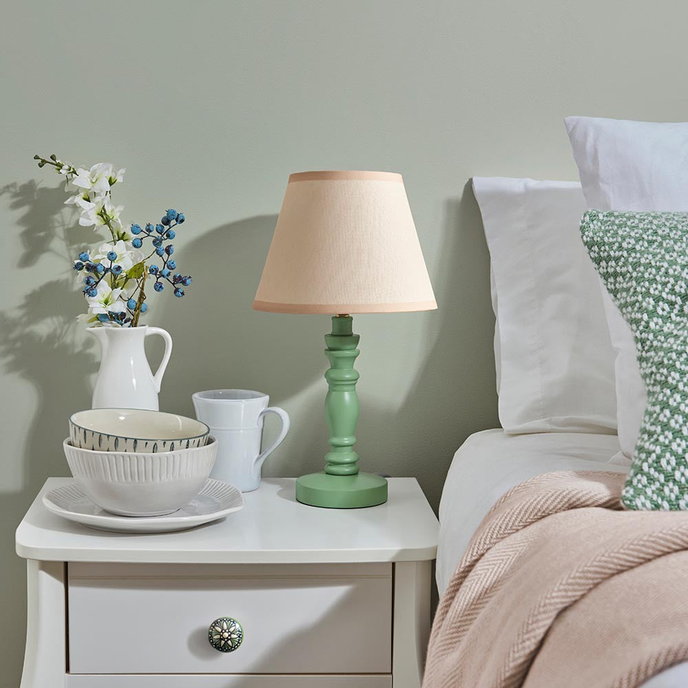 A beautiful wooden turned spindle light, painted satin Cotswold green. Perfect for classic interiors, featuring a brass B22 switched lamp holder and grey braided fabric flex. Paired with our vintage & almond white 20cm Ivy shade for a unique, classic look.