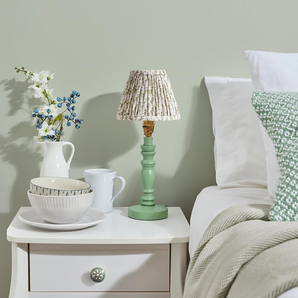 A beautiful wooden turned spindle light, painted satin Cotswold green. Perfect for classic interiors, featuring a brass B22 switched lamp holder and grey braided fabric flex. Paired with our subtle herb green 16cm Leaf shade for a unique, classic look.
