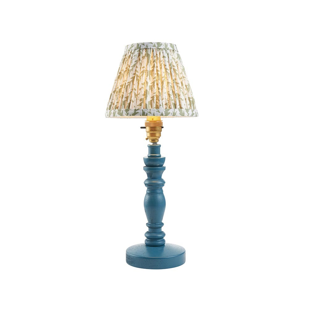 A beautiful wooden turned spindle light, painted in satin marlin blue. Perfect for classic interiors, featuring a brass B22 switched lamp holder and grey braided fabric flex. Paired with our herb green bay 16cm Leaf shade for a unique, classic look.