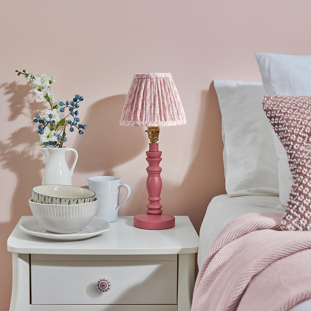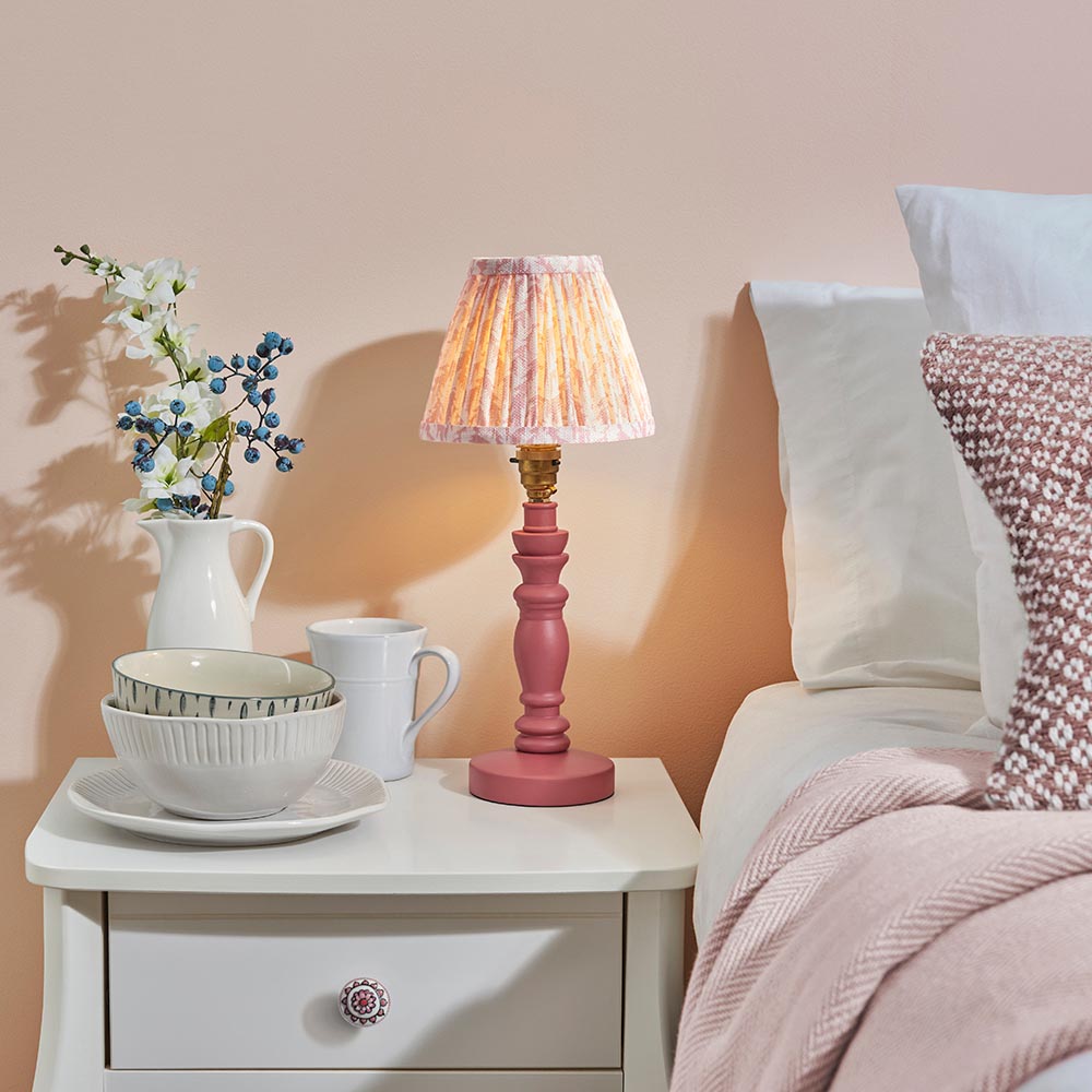A beautiful wooden turned spindle light, painted satin pink clay. Perfect for classic interiors, featuring a brass B22 switched lamp holder and grey braided fabric flex. Paired with our subtle peachy keen 16cm Leaf shade for a unique, classic look.