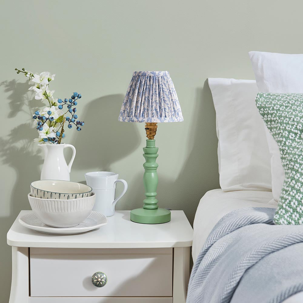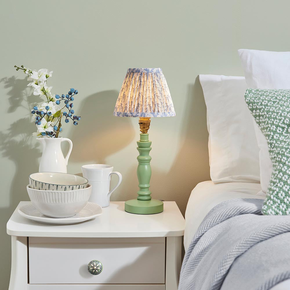 A beautiful wooden turned spindle light, painted satin Cotswold green. Perfect for classic interiors, featuring a brass B22 switched lamp holder and grey braided fabric flex. Paired with our subtle shell bay blue 16cm Leaf shade for a unique, classic look.