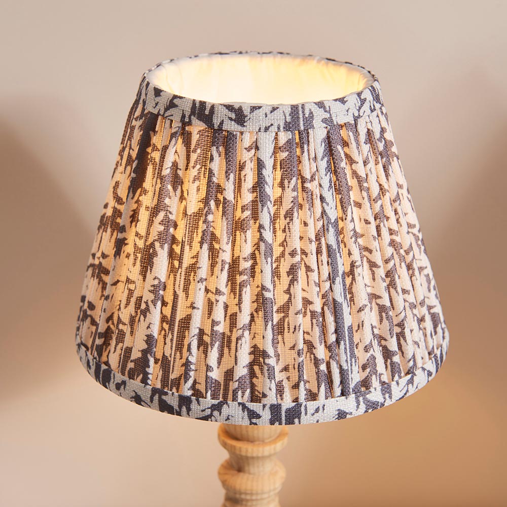 Beautiful natural Ash wooden turned spindle table light, perfect for classic interiors; featuring a brass B22 switched lamp holder and grey braided fabric flex. Paired with our subtle pearl grey 20cm Leaf shade for a unique classic look.