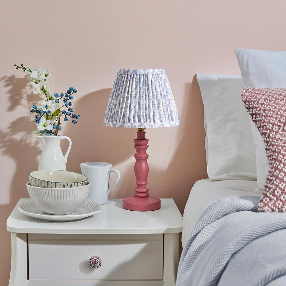 A beautiful wooden turned spindle light, painted satin pink clay. Perfect for classic interiors, featuring a brass B22 switched lamp holder and grey braided fabric flex. Paired with our subtle shell bay blue 20cm Leaf shade for a unique, classic look.