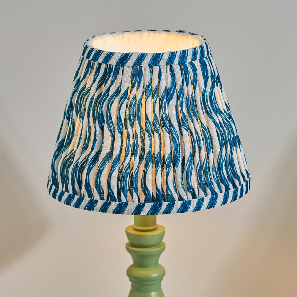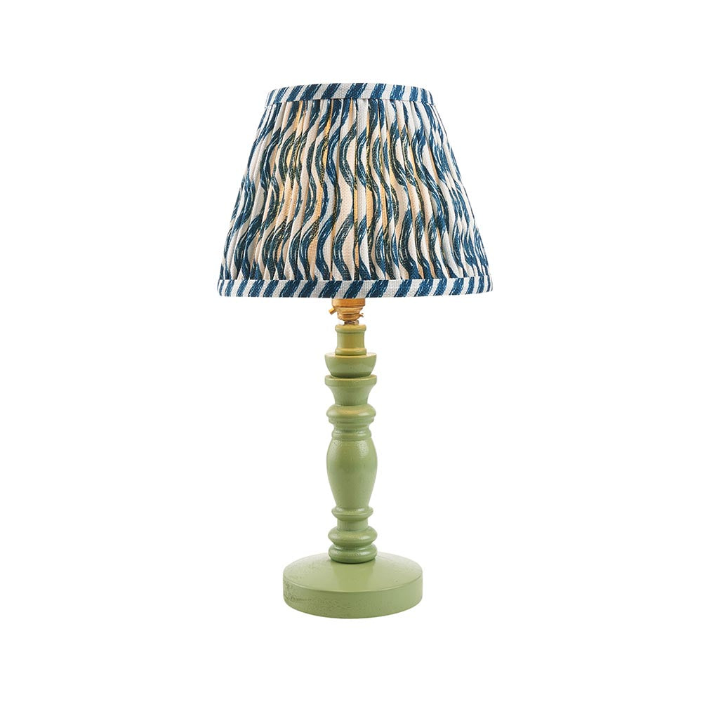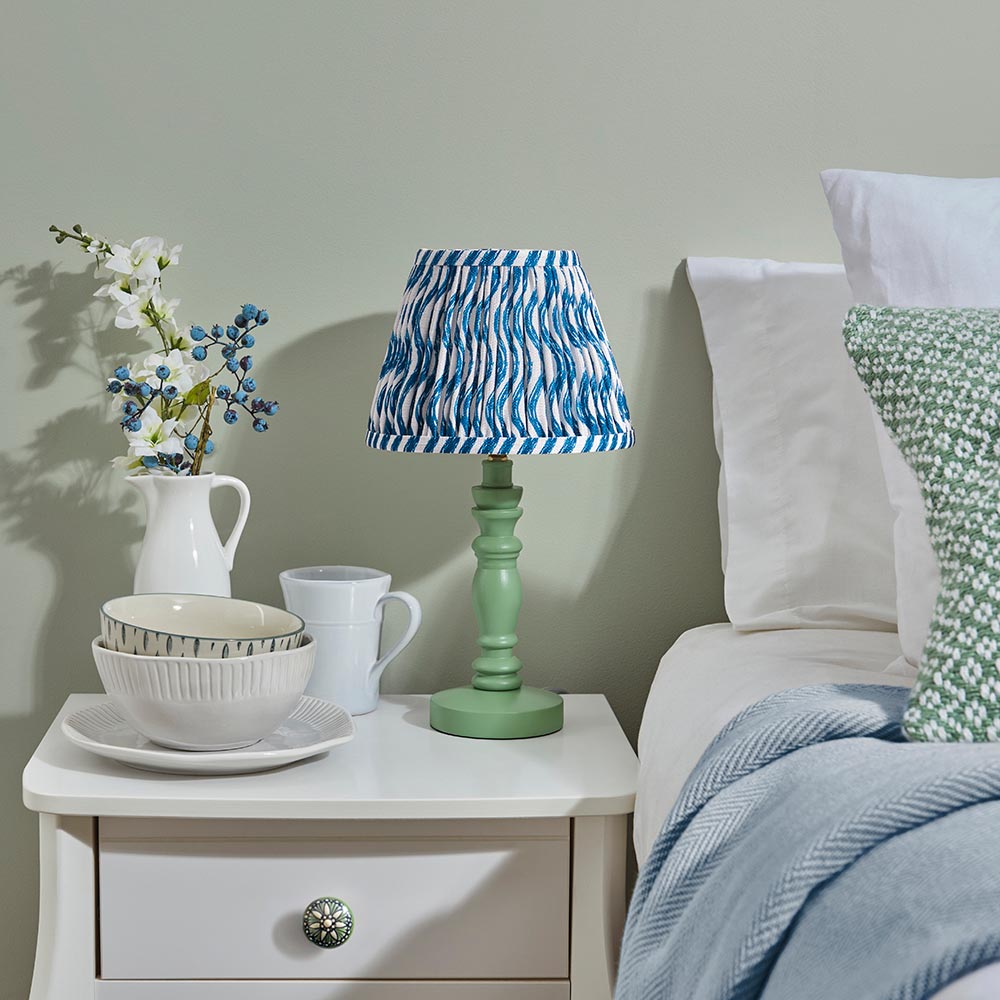 A beautiful wooden turned spindle light, painted satin Cotswold green. Perfect for classic interiors, featuring a brass B22 switched lamp holder and grey braided fabric flex. Paired with our vibrant marlin blue 20cm Ripple shade for a unique, classic look.