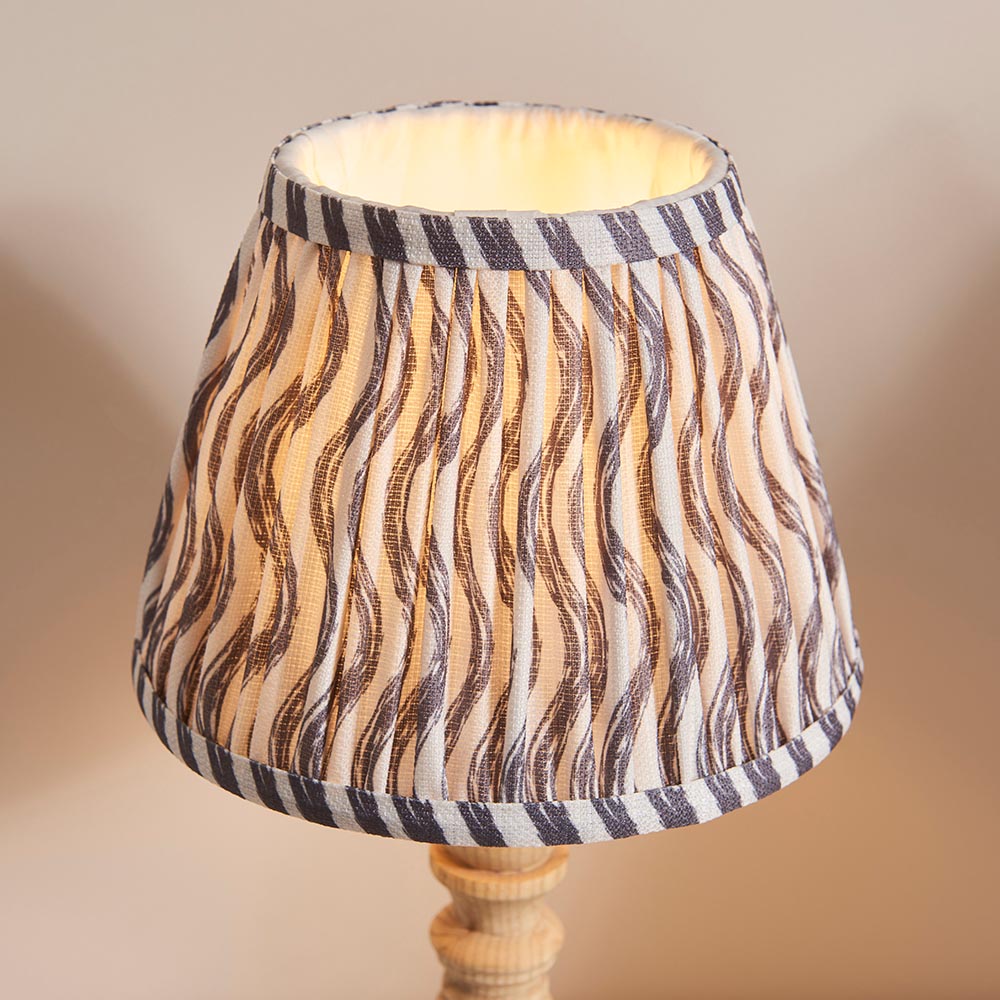 Beautiful natural Ash wooden turned spindle table light, perfect for classic interiors; featuring a brass B22 switched lamp holder and grey braided fabric flex. Paired with our stylish pearl grey 20cm Ripple shade for a unique classic look.
