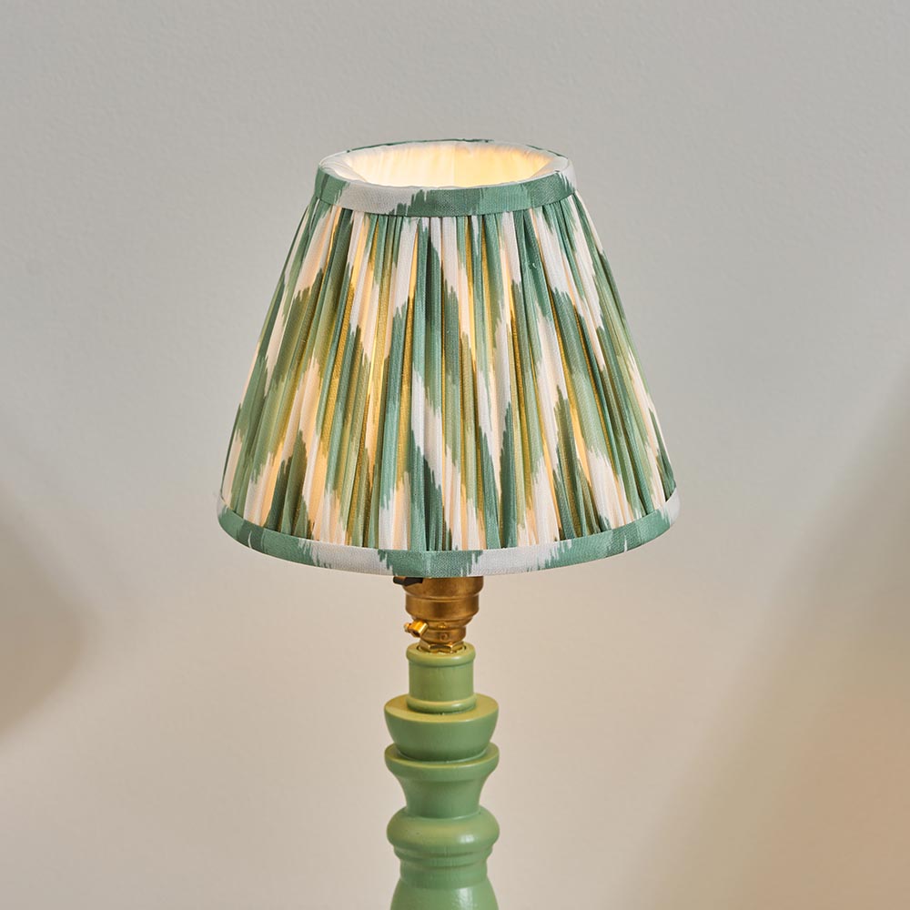 A beautiful wooden turned spindle light, painted satin Cotswold green. Perfect for classic interiors, featuring a brass B22 switched lamp holder and grey braided fabric flex. Paired with our bold Cotswold green 16cm Zigzag shade for a unique, classic look.