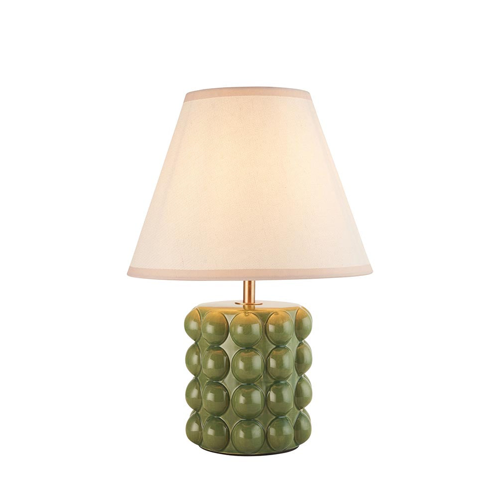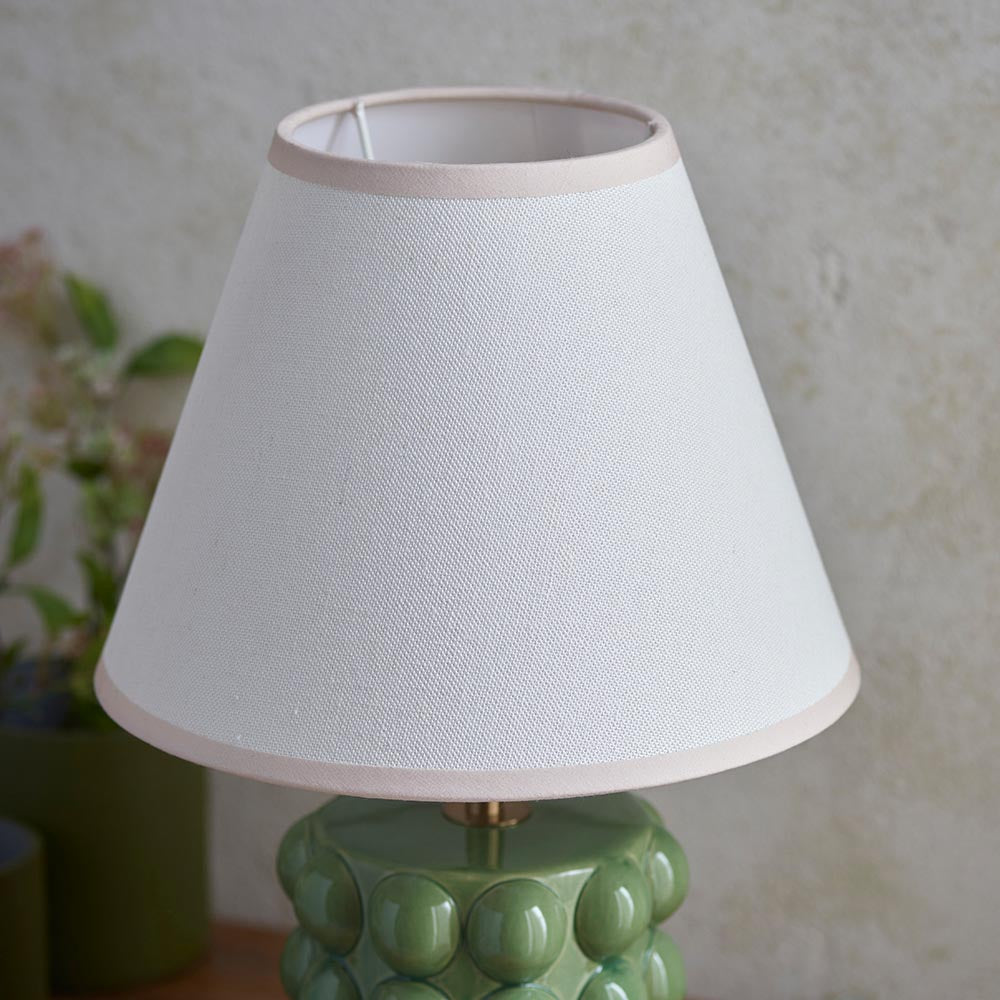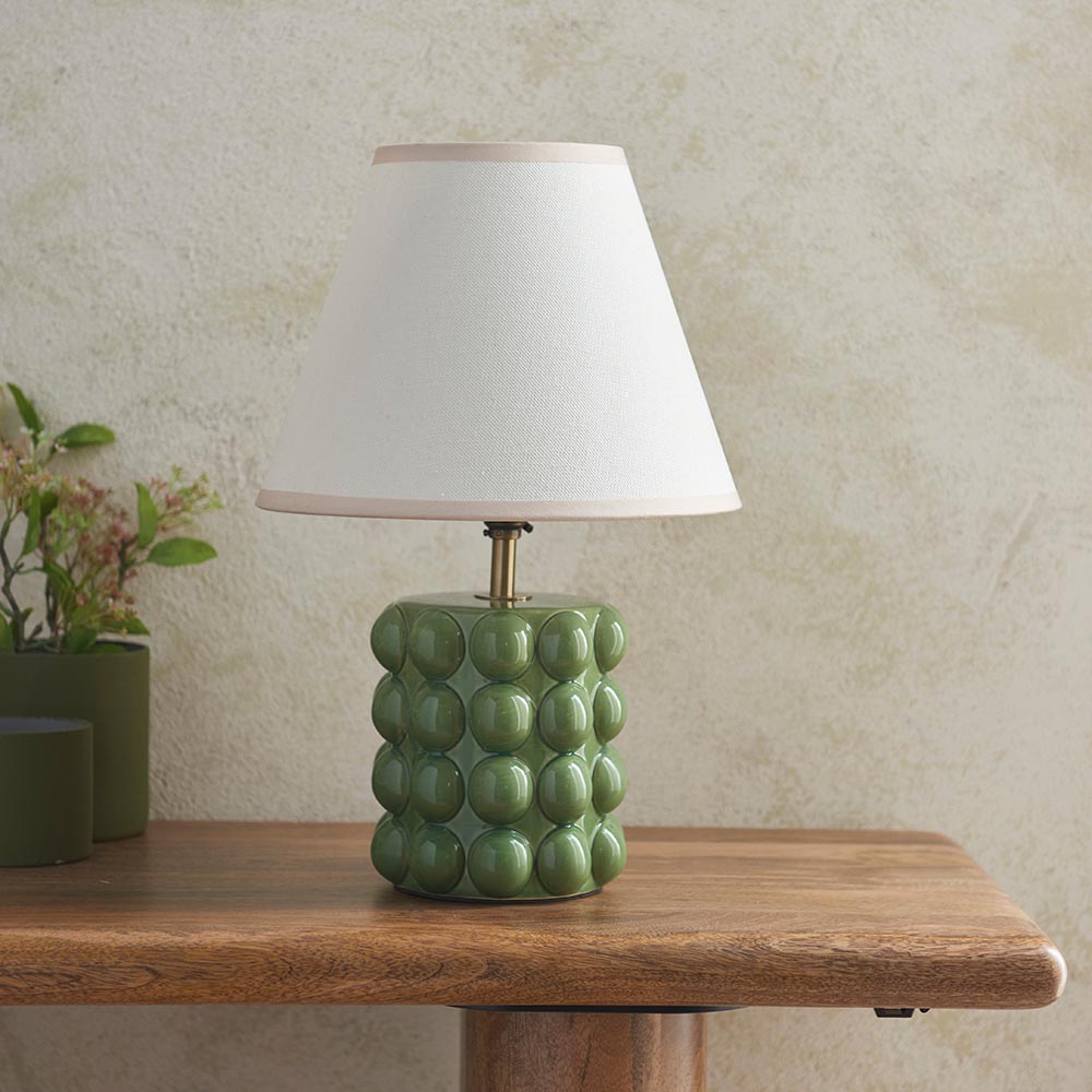 This playful ceramic base features sculptured bobble shapes finished in a gloss olive green glaze. With a switched brass B22 lamp holder and grey braided flex, paired with our vintage & almond white 25cm shade.