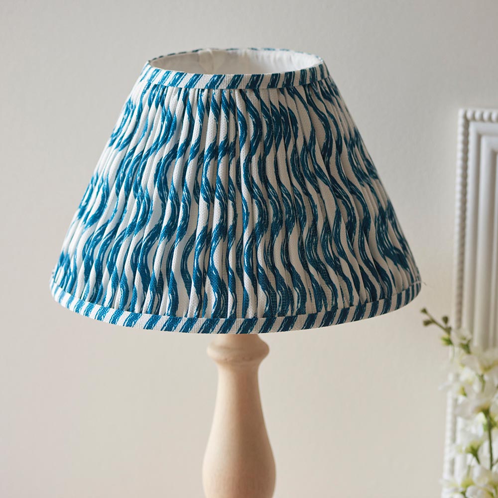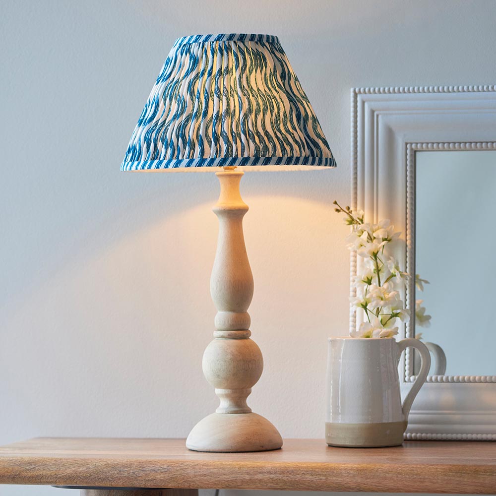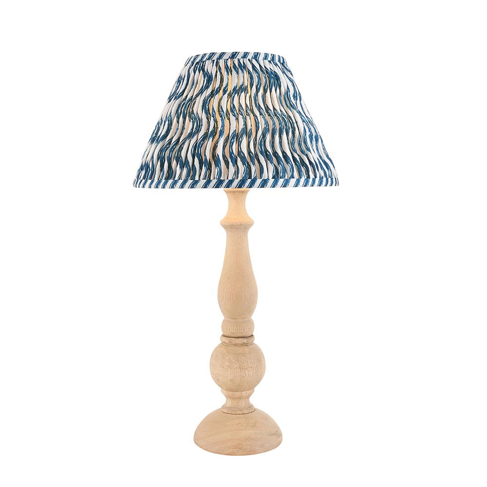 An elegant country classic style table light, hand turned in solid natural wood finish. With switched brass B22 lamp holder and grey braided fabric flex. Paired with our vibrant marlin blue 30cm Ripple shade to complete the look.