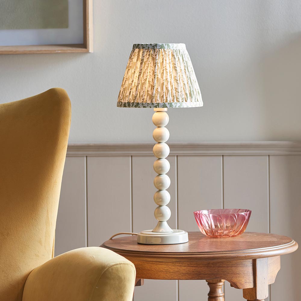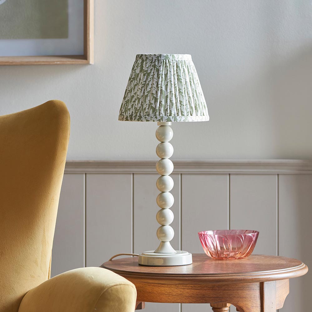 Add some colour to your home with this playful table light. Multiple stacked metal spheres finished in gloss almond white paint with an E14 lamp holder, in-line on/off switch and colour matched fabric flex. Paired with our subtle herb green Leaf 20cm shade to complete this perfect colour addition to your home.
