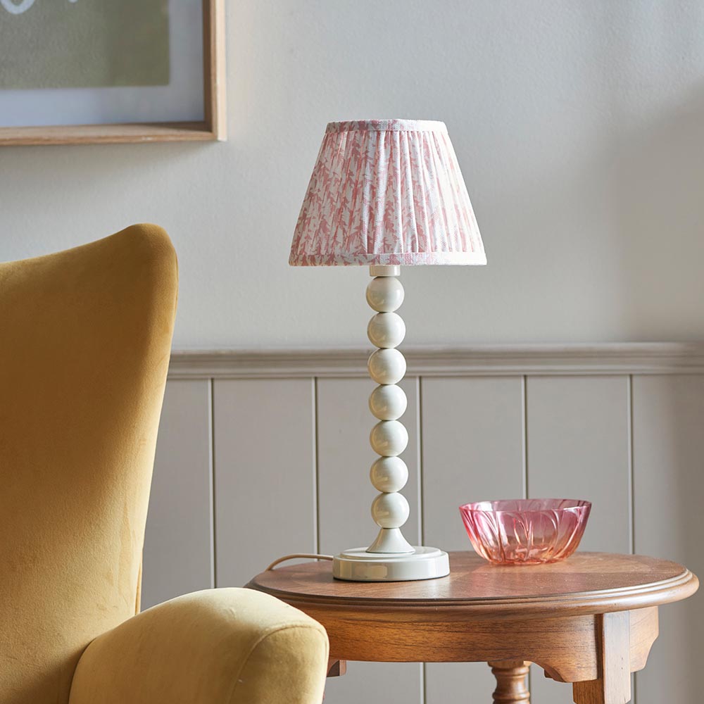 Add some colour to your home with this playful table light. Multiple stacked metal spheres finished in gloss almond white paint with an E14 lamp holder, in-line on/off switch and colour matched fabric flex. Paired with our subtle peachy keen Leaf 20cm shade to complete this perfect colour addition to your home.