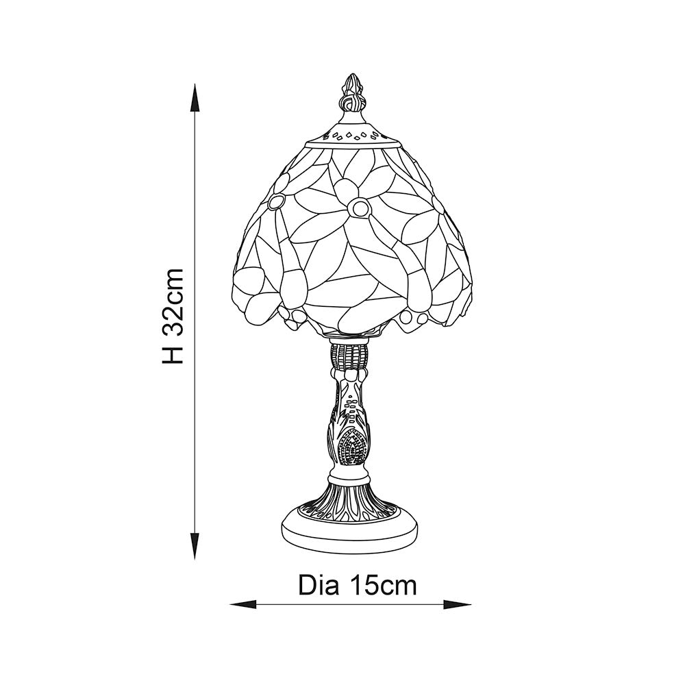 A mini lamp featuring the traditional satin black base, and brightly coloured tiffany style glass. Compatible with LED lamps
