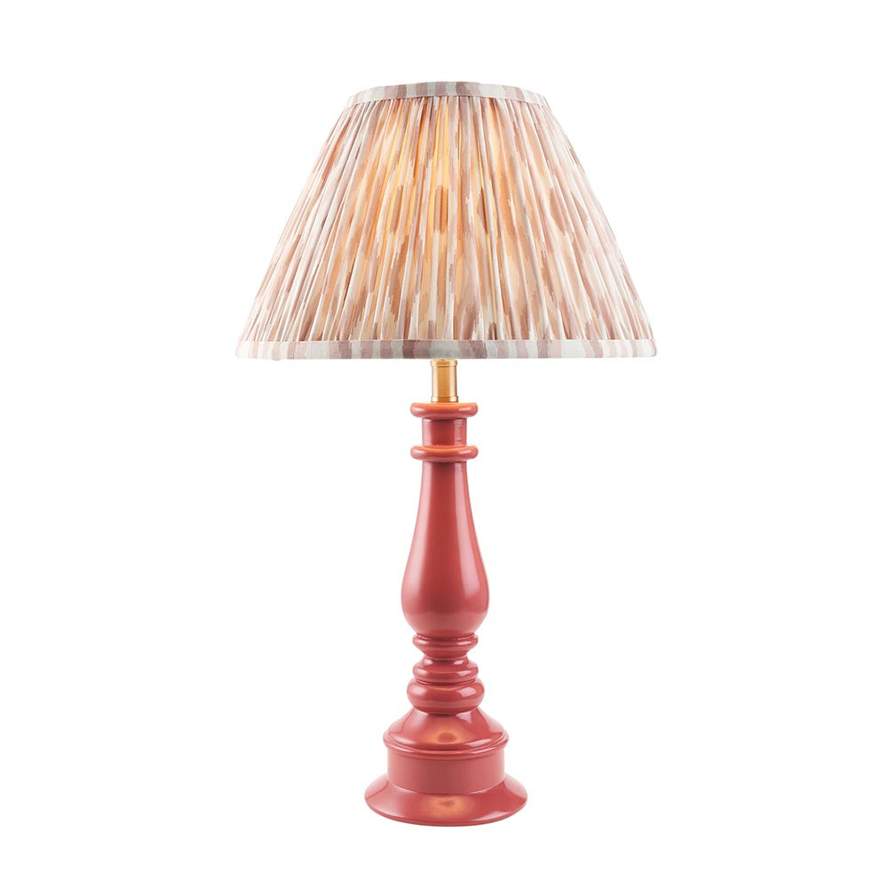 Getting its inspiration from turned classic staircase spindles, this table light is finished in high gloss pink clay colour resin, with a switched B22 brass lamp holder and pale braided fabric flex. Finished with our natural 30cm Ikat shade to complete this timeless country luxe look.