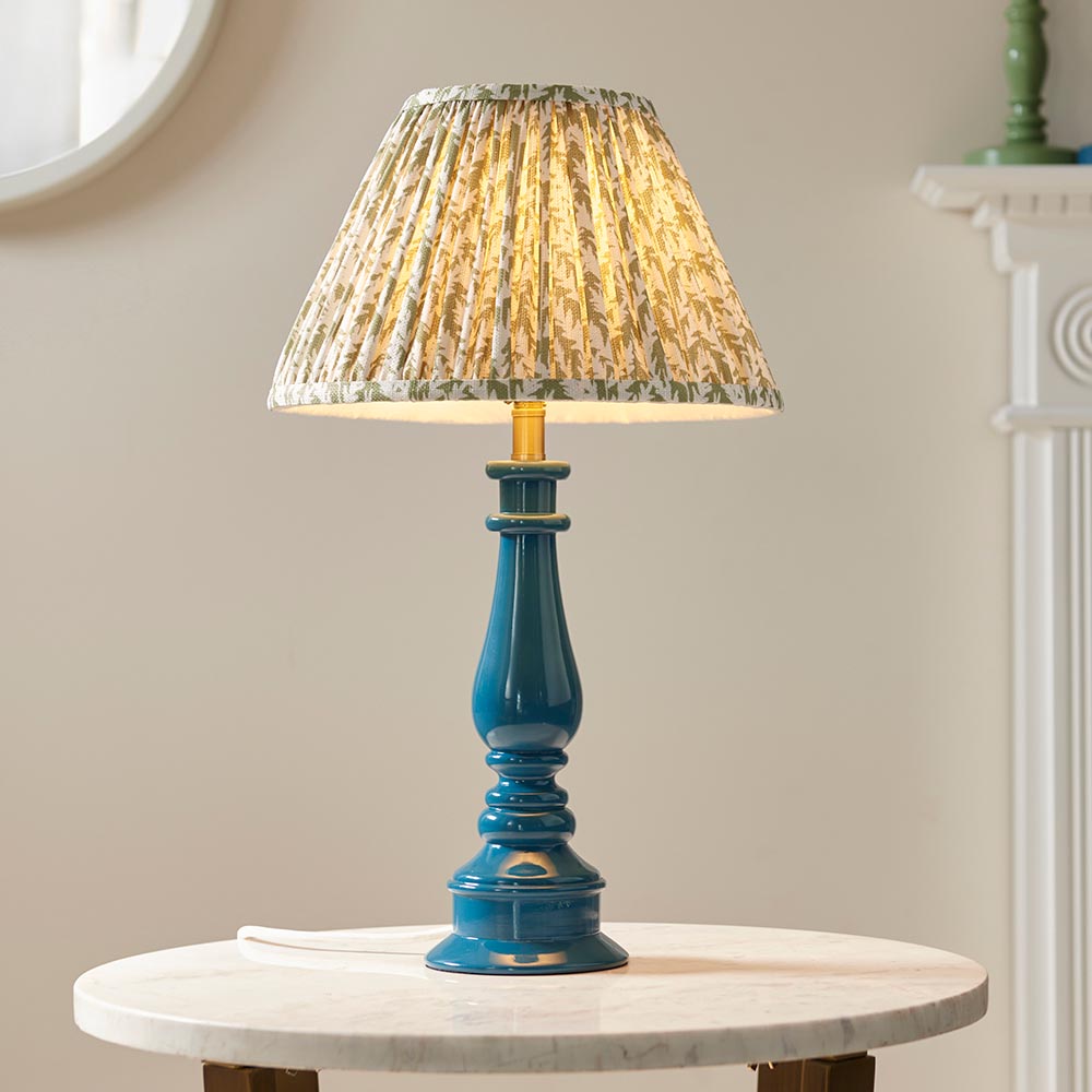 Getting its inspiration from turned classic staircase spindles, this table light is finished in high gloss marlin blue colour resin, with switched B22 brass lamp holder and pale braided fabric flex. Paired with our subtle 30cm herb green Leaf shade to complete this timeless country luxe look.