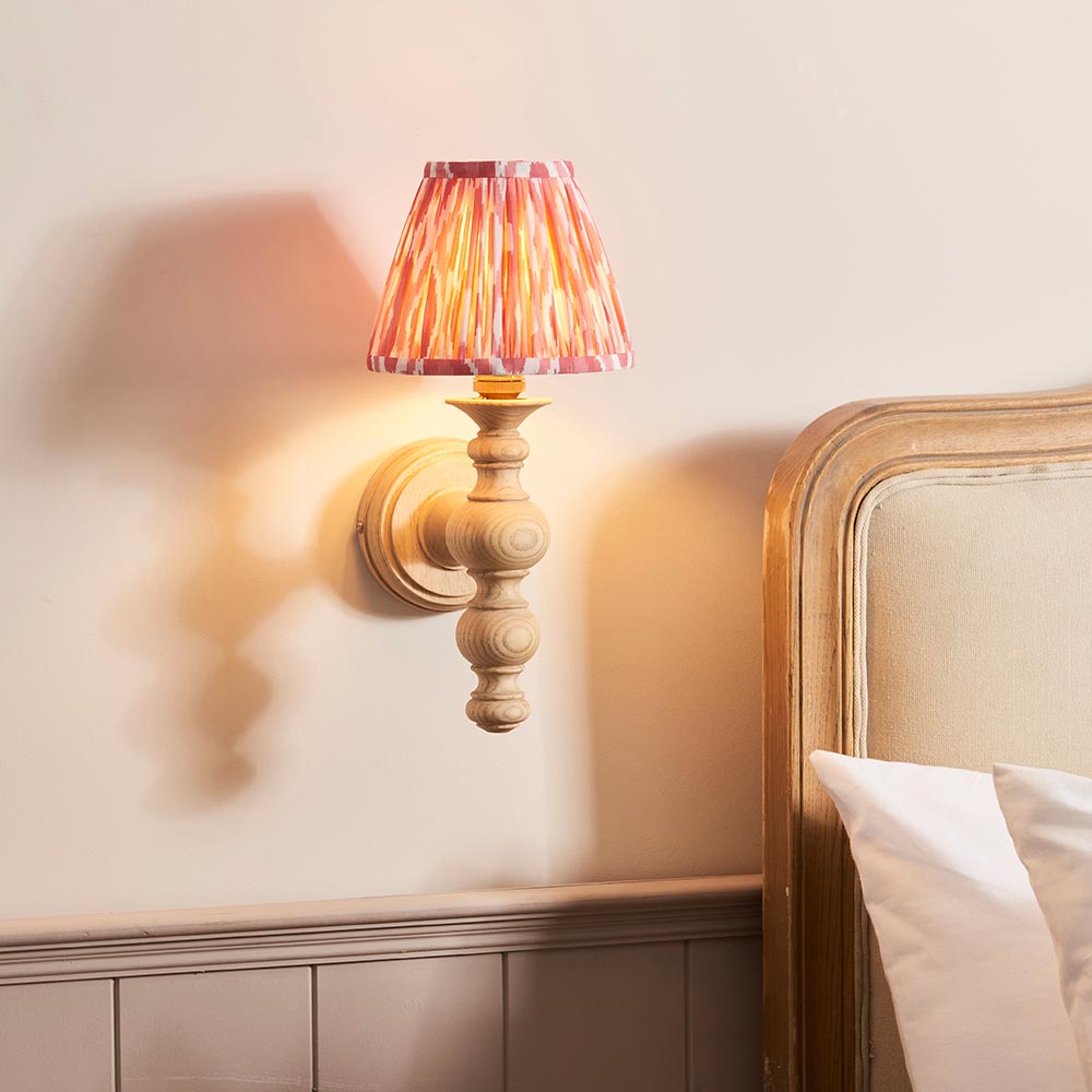 Beautiful natural Ash wooden turned spindle wall light, perfect for classic interiors, featuring a brass B22 lamp holder. Finished with our vibrant coral pink 16cm Ikat shade for a unique, classic look.