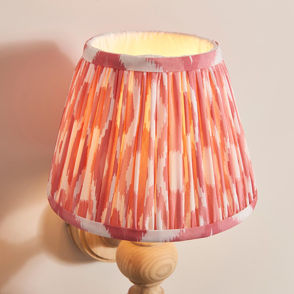 Beautiful natural Ash wooden turned spindle wall light, perfect for classic interiors, featuring a brass B22 lamp holder. Finished with our vibrant coral pink 20cm Ikat shade for a unique, classic look.
