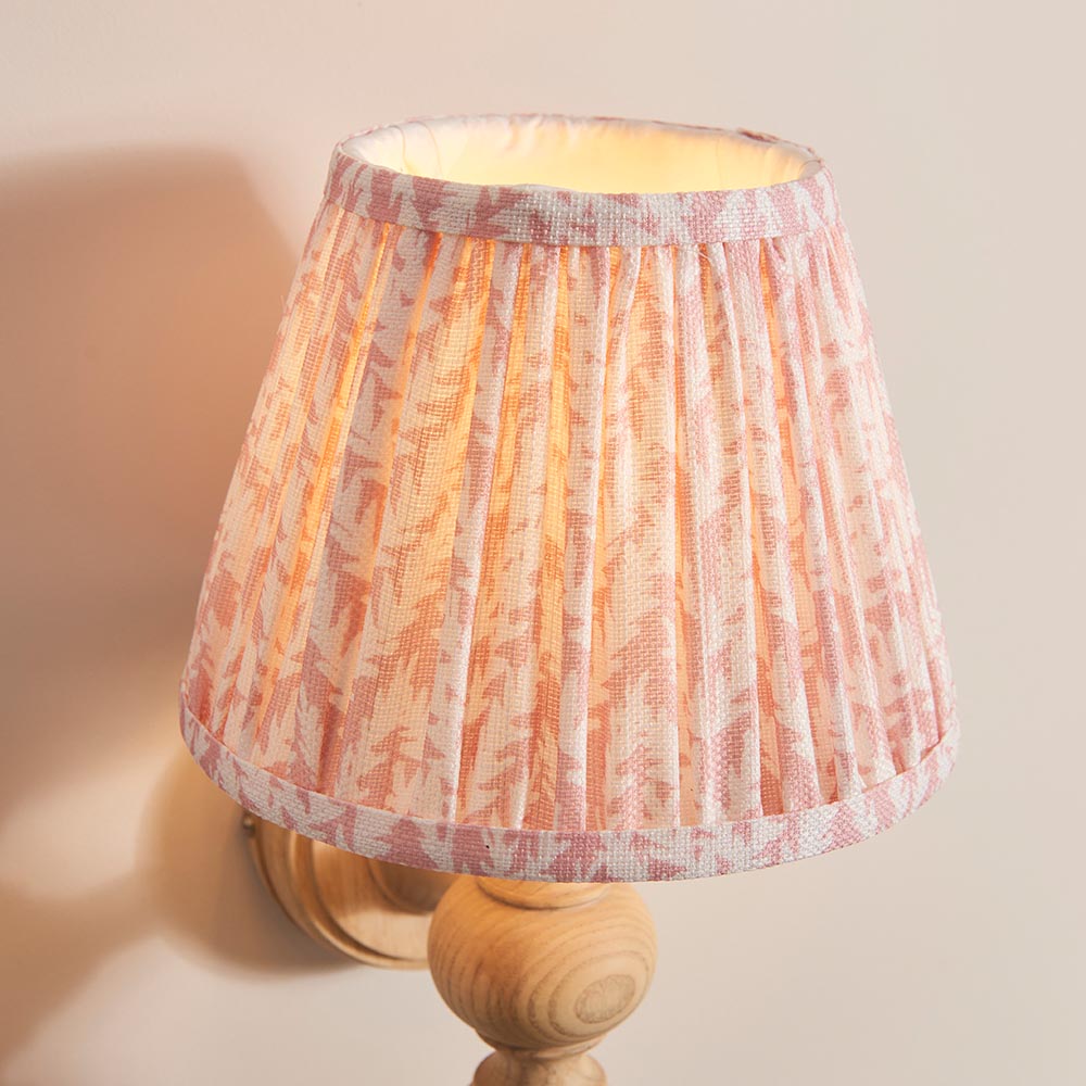 Beautiful natural Ash wooden turned spindle wall light, perfect for classic interiors, featuring a brass B22 lamp holder. Finished with our subtle peachy keen 20cm Leaf shade for a unique, classic look.
