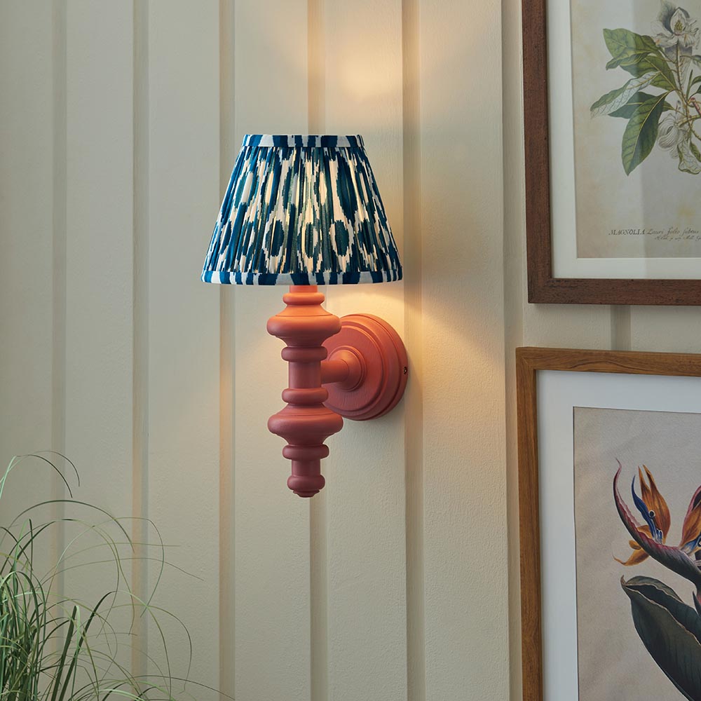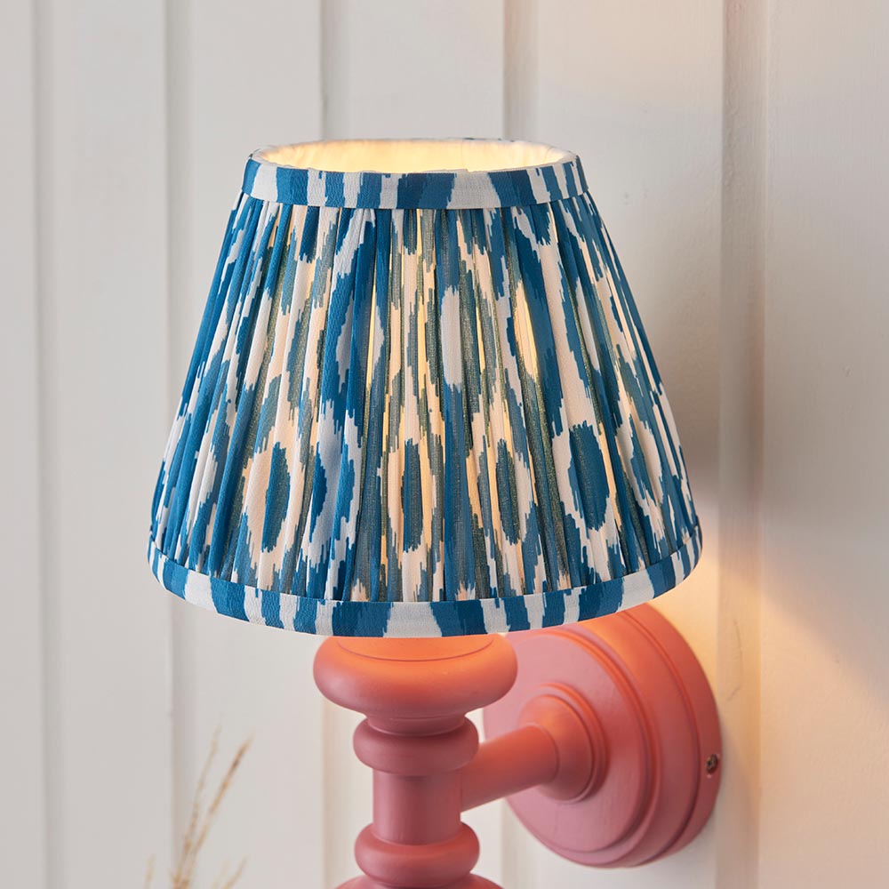 This unique wooden turned spindle wall light is inspired by past design styles with a fresh update. Painted in classic satin pink clay with a brass B22 lamp holder for that timeless authentic look. Paired with our vibrant marlin blue 20cm Ikat shade for a unique, classic style.