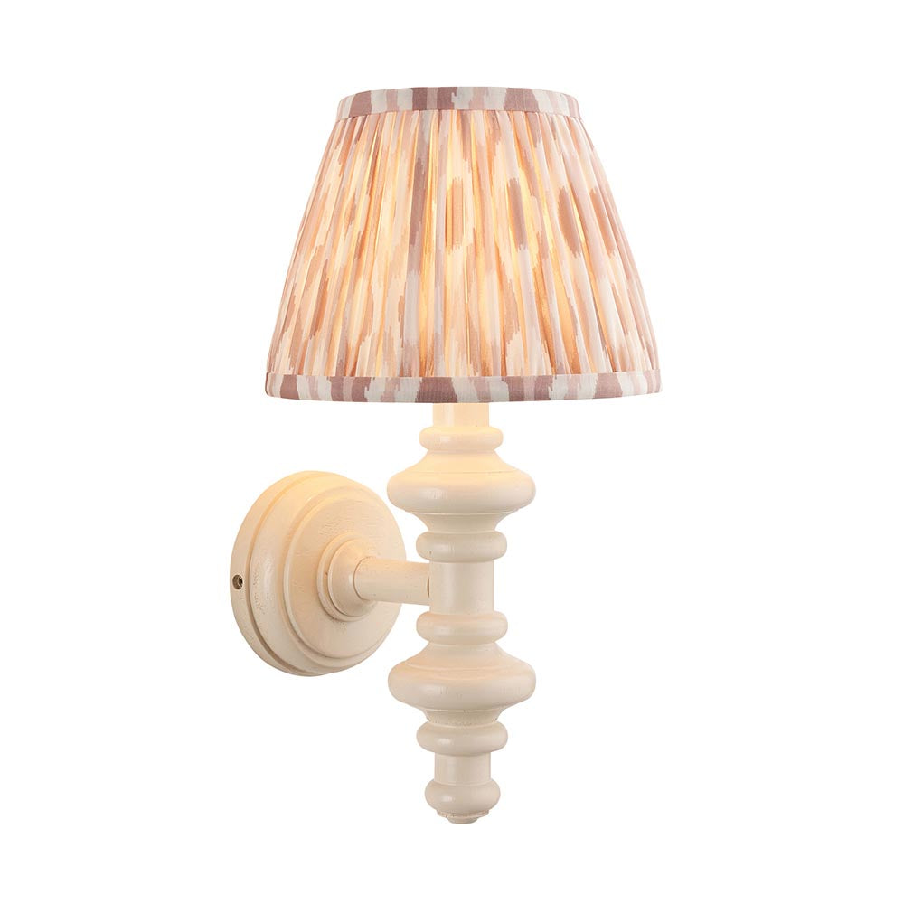 This unique wooden turned spindle wall light is inspired by past design styles with a fresh update. Painted in classic satin almond white with a brass B22 lamp holder for that timeless authentic look. Paired with our natural 20cm Ikat shade for a unique, classic style.