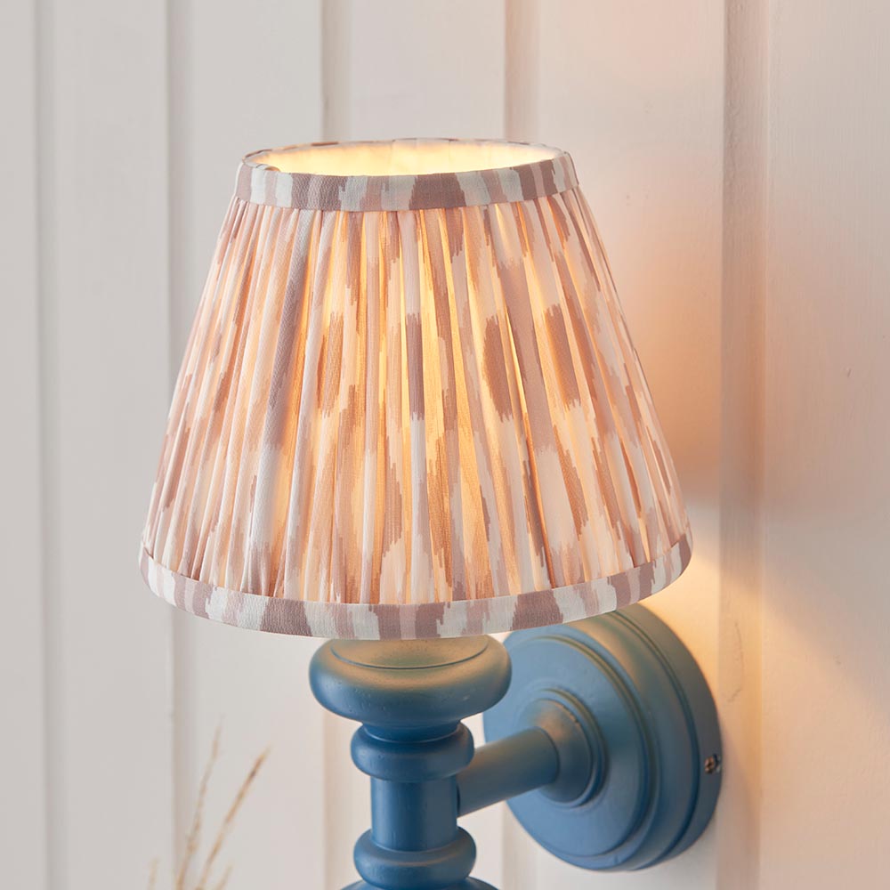 This unique wooden turned spindle wall light is inspired by past design styles with a fresh update. Painted in classic satin marlin blue with a brass B22 lamp holder for that timeless authentic look. Paired with our natural 20cm Ikat shade for a unique, classic style.