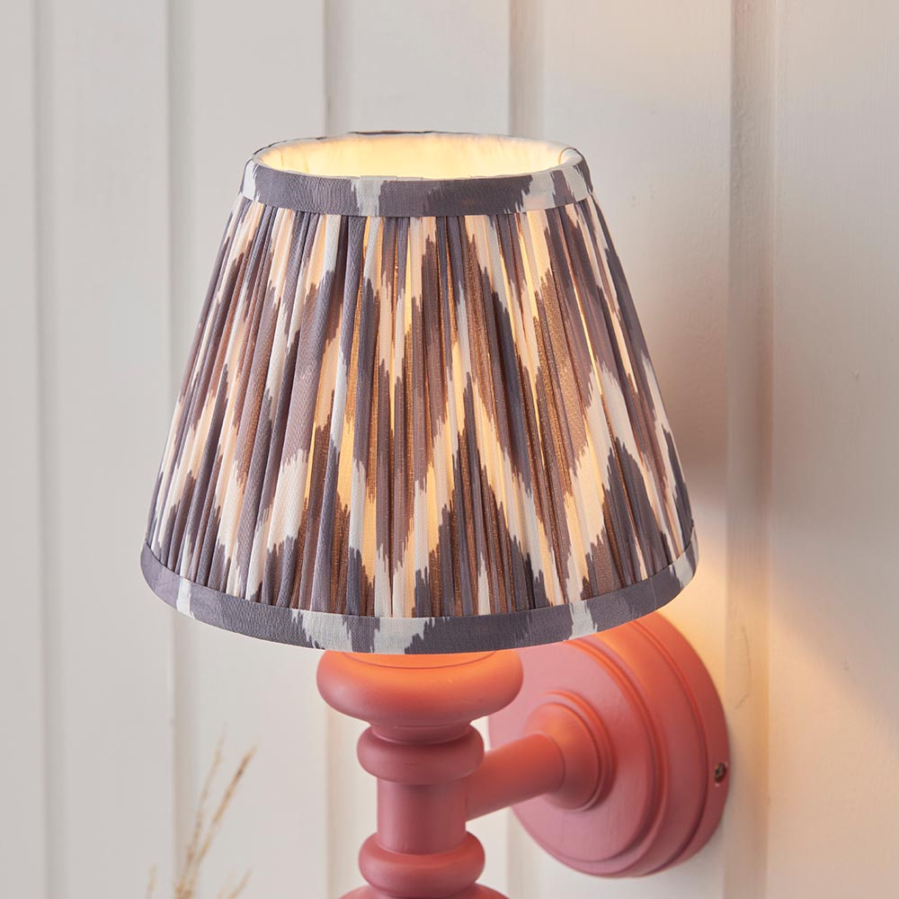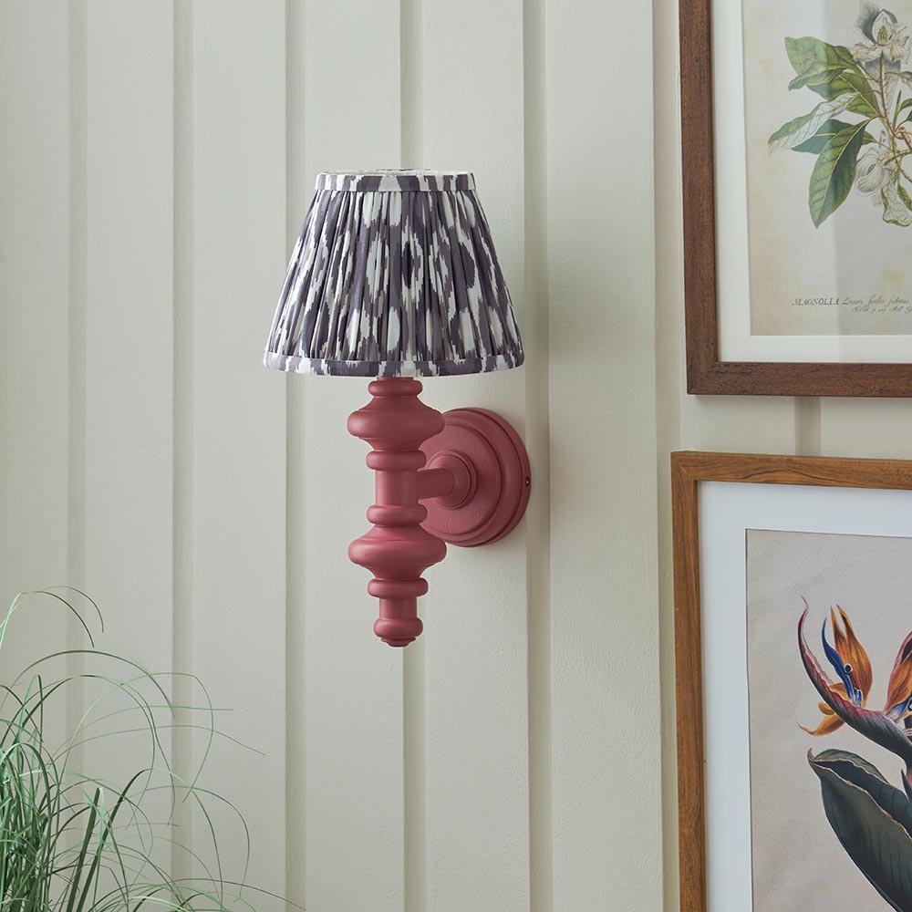 This unique wooden turned spindle wall light is inspired by past design styles with a fresh update. Painted in classic satin pink clay with a brass B22 lamp holder for that timeless authentic look. Paired with our stylish pearl grey 20cm Ikat shade for a unique, classic style.