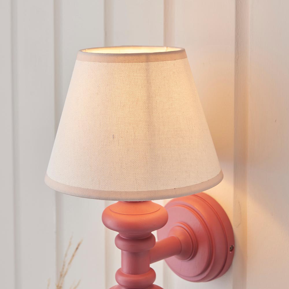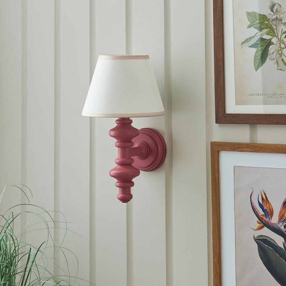 This unique wooden turned spindle wall light is inspired by past design styles with a fresh update. Painted in classic satin pink clay with a brass B22 lamp holder for that timeless authentic look. Paired with our vintage & almond white 20cm Ivy shade for a unique, classic style.