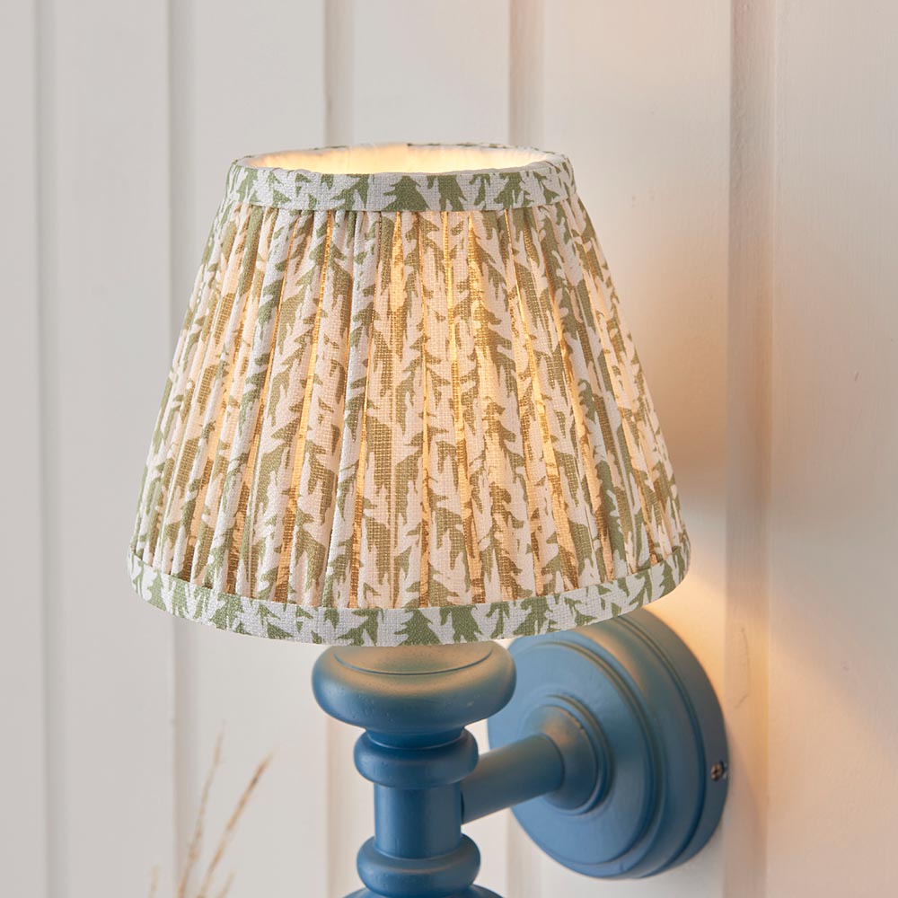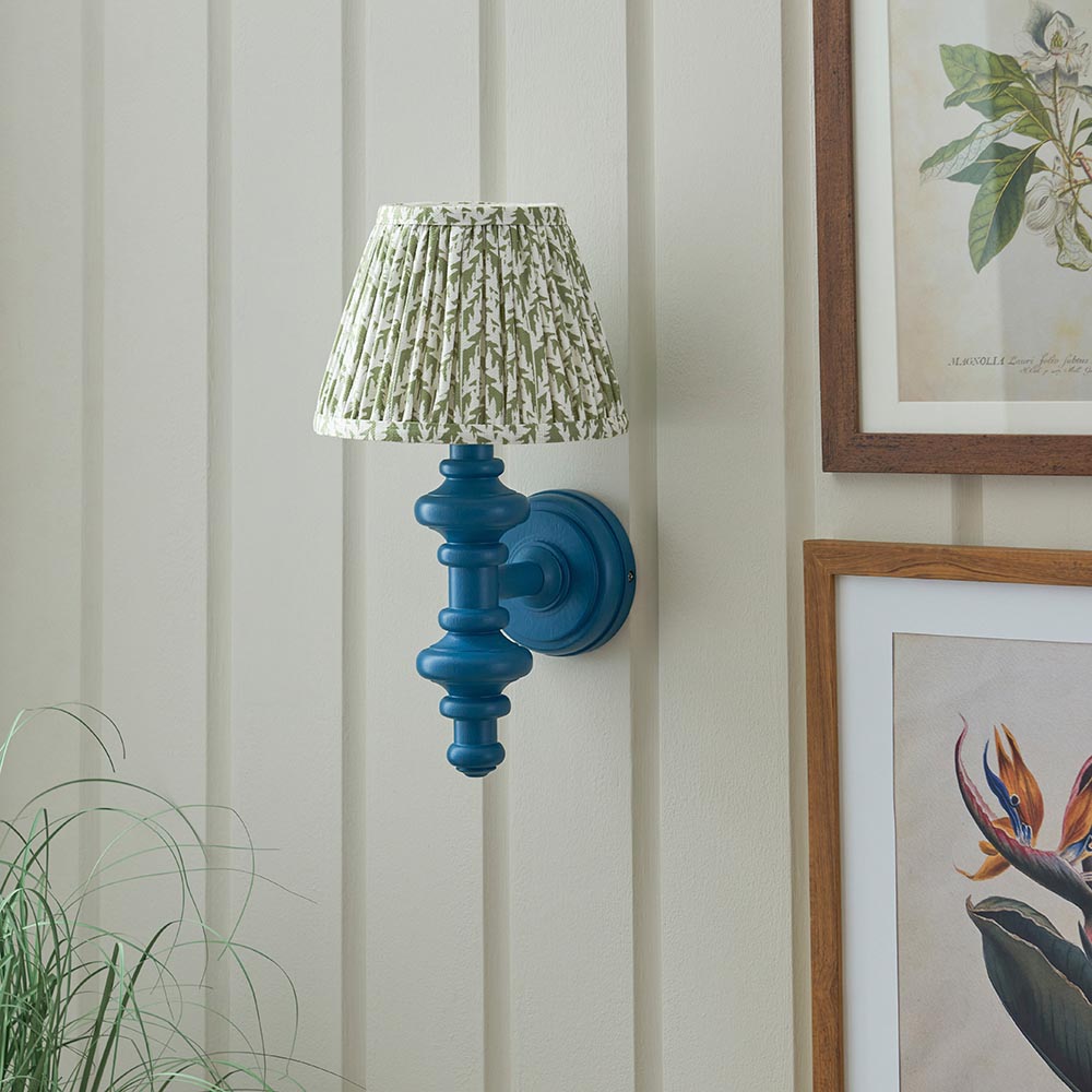 This unique wooden turned spindle wall light is inspired by past design styles with a fresh update. Painted in classic satin marlin blue with a brass B22 lamp holder for that timeless authentic look. Paired with our subtle herb green 20cm Leaf shade for a unique, classic style.