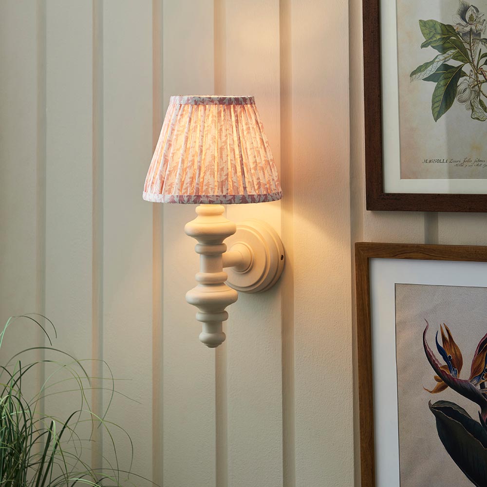 This unique wooden turned spindle wall light is inspired by past design styles with a fresh update. Painted in classic satin almond white with a brass B22 lamp holder for that timeless authentic look. Paired with our subtle peachy keen 20cm Leaf shade for a unique, classic style.