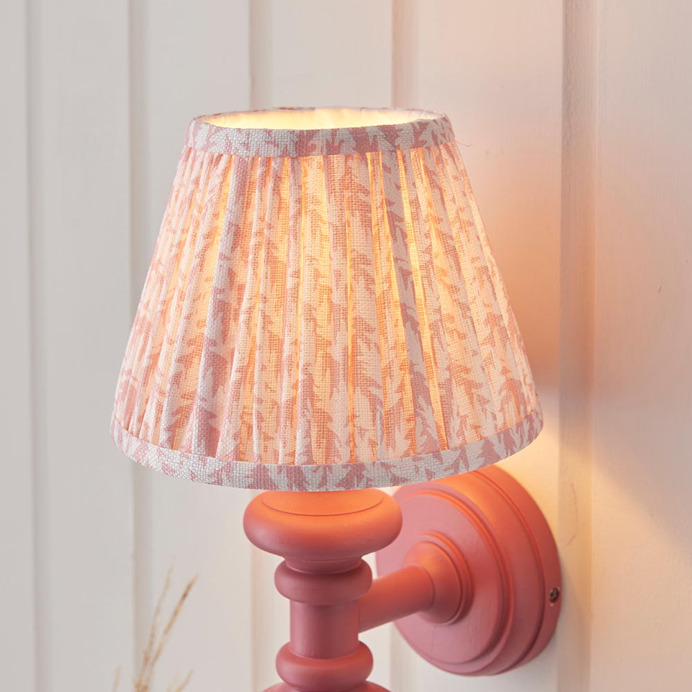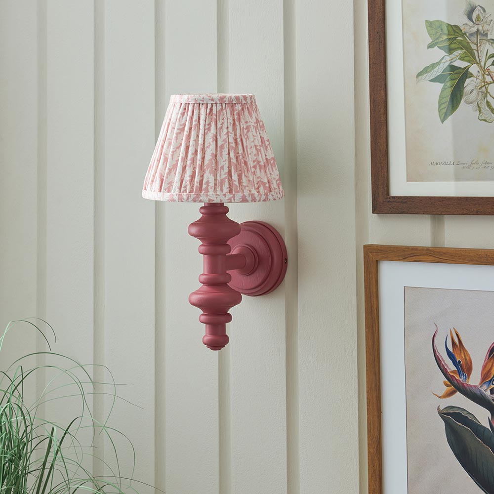 This unique wooden turned spindle wall light is inspired by past design styles with a fresh update. Painted in classic satin pink clay with a brass B22 lamp holder for that timeless authentic look. Paired with our subtle peachy keen 20cm Leaf shade for a unique, classic style.
