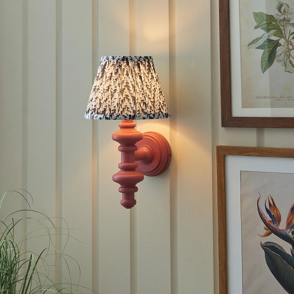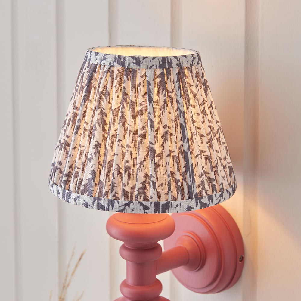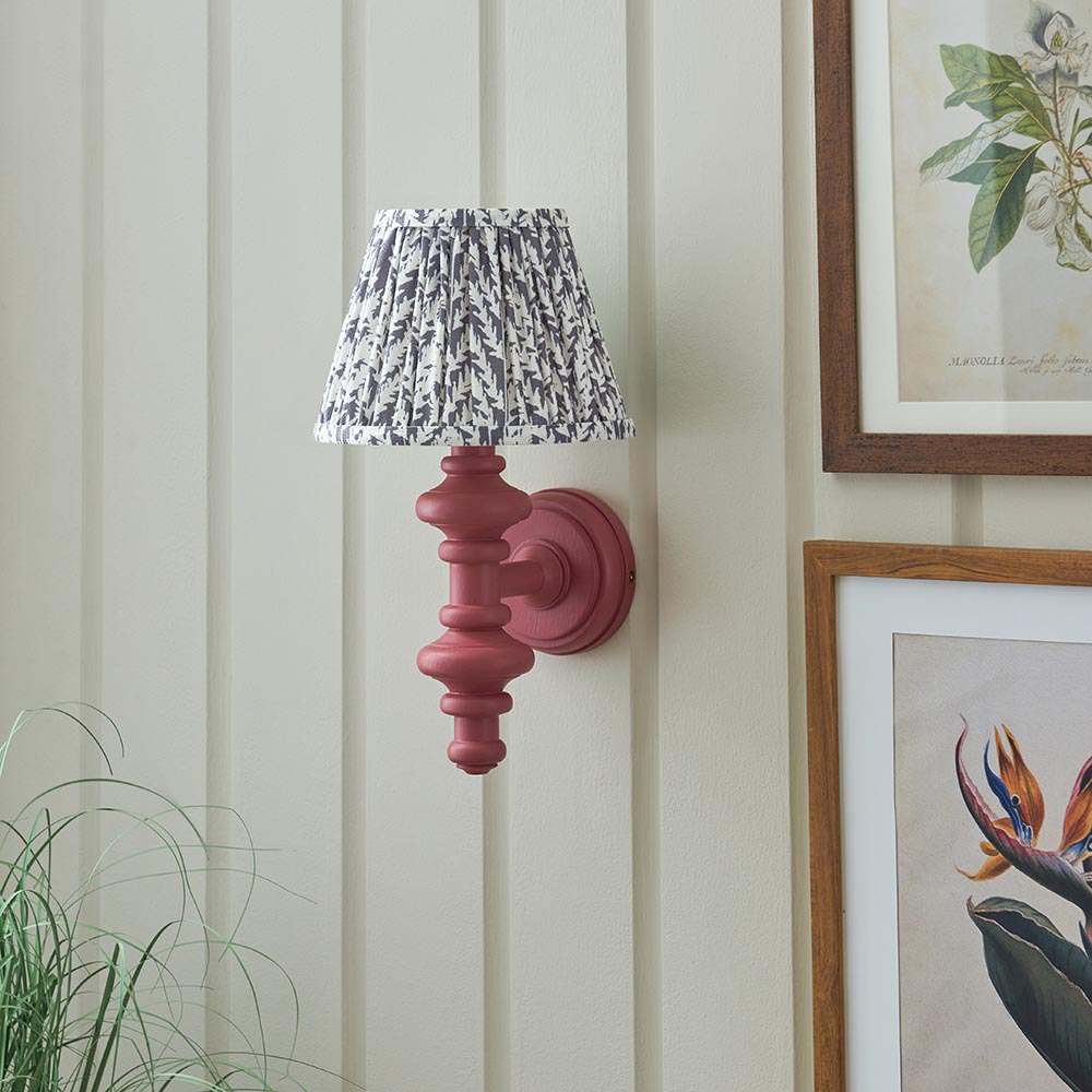 This unique wooden turned spindle wall light is inspired by past design styles with a fresh update. Painted in classic satin pink clay with a brass B22 lamp holder for that timeless authentic look. Paired with our subtle pearl grey 20cm Leaf shade for a unique, classic style.