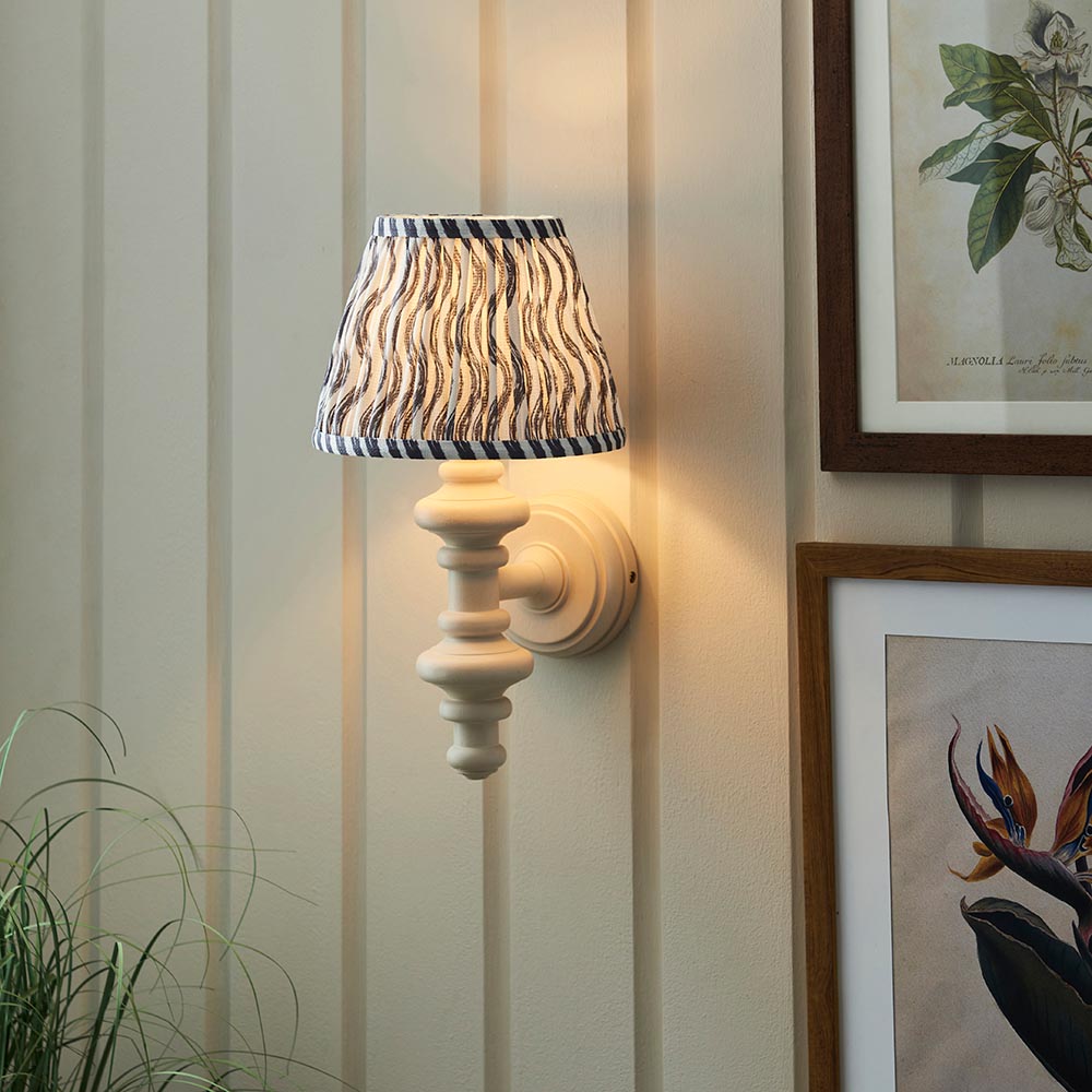This unique wooden turned spindle wall light is inspired by past design styles with a fresh update. Painted in classic satin almond white with a brass B22 lamp holder for that timeless authentic look. Paired with our stylish pearl grey 20cm Ripple shade for a unique, classic style.