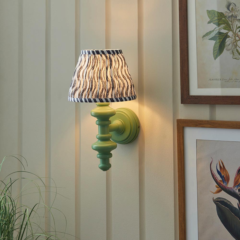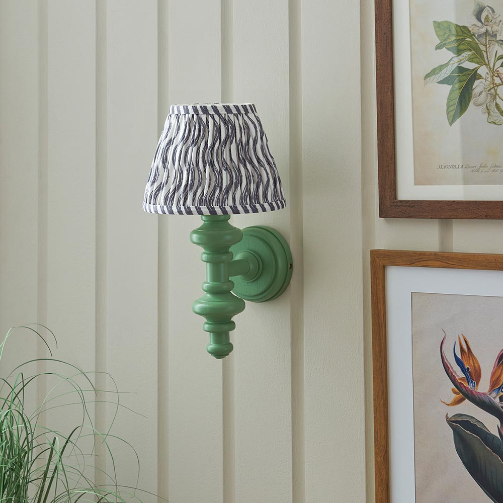 This unique wooden turned spindle wall light is inspired by past design styles with a fresh update. Painted in classic satin Cotswold green with a brass B22 lamp holder for that timeless authentic look. Paired with our stylish pearl grey 20cm Ripple shade for a unique, classic style.
