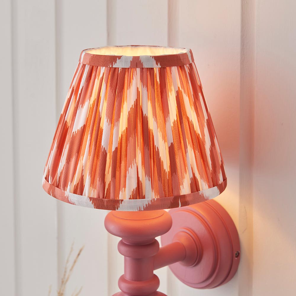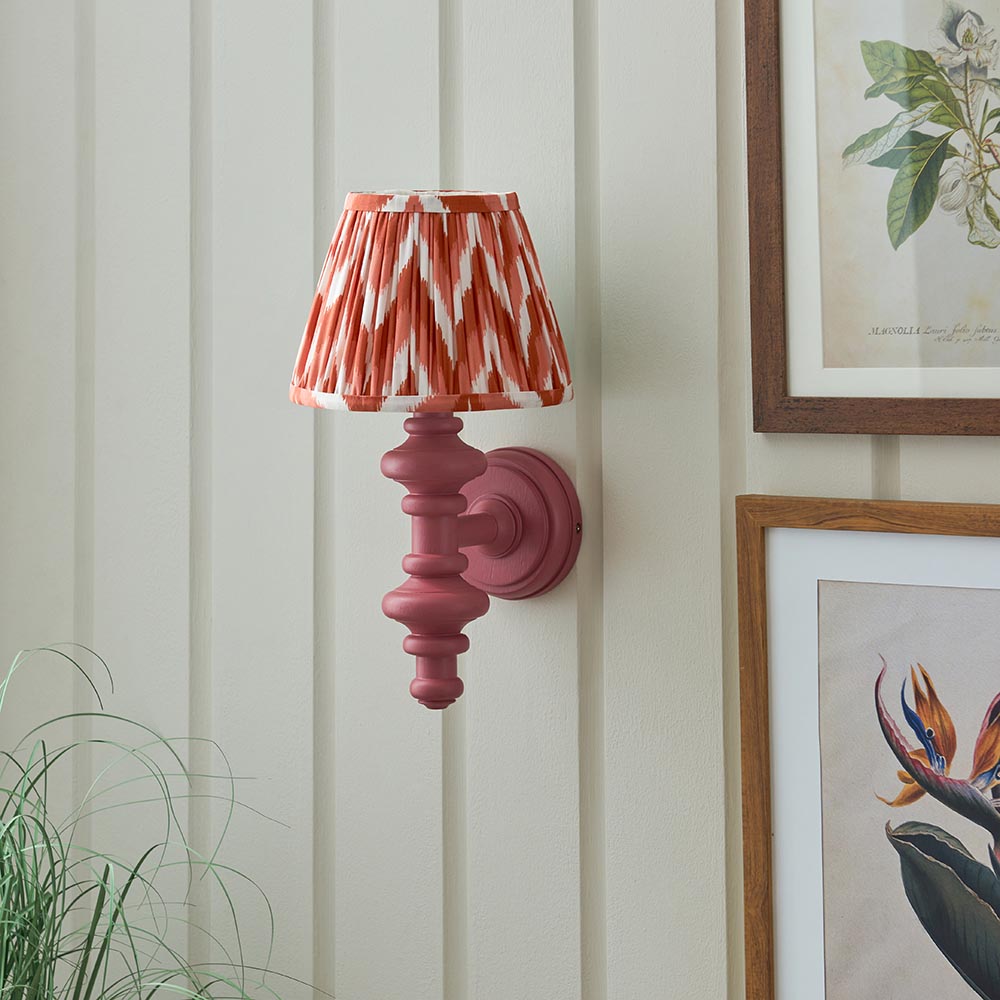 This unique wooden turned spindle wall light is inspired by past design styles with a fresh update. Painted in classic satin pink clay with a brass B22 lamp holder for that timeless authentic look. Paired with our bright apricot orange 20cm Zigzag shade for a unique, classic style.