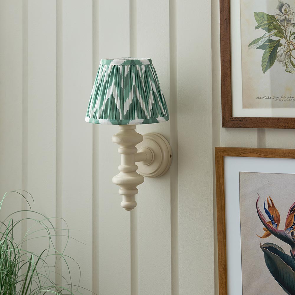This unique wooden turned spindle wall light is inspired by past design styles with a fresh update. Painted in classic satin almond white with a brass B22 lamp holder for that timeless authentic look. Paired with our bold Cotswold green 20cm Zigzag shade for a unique, classic style.