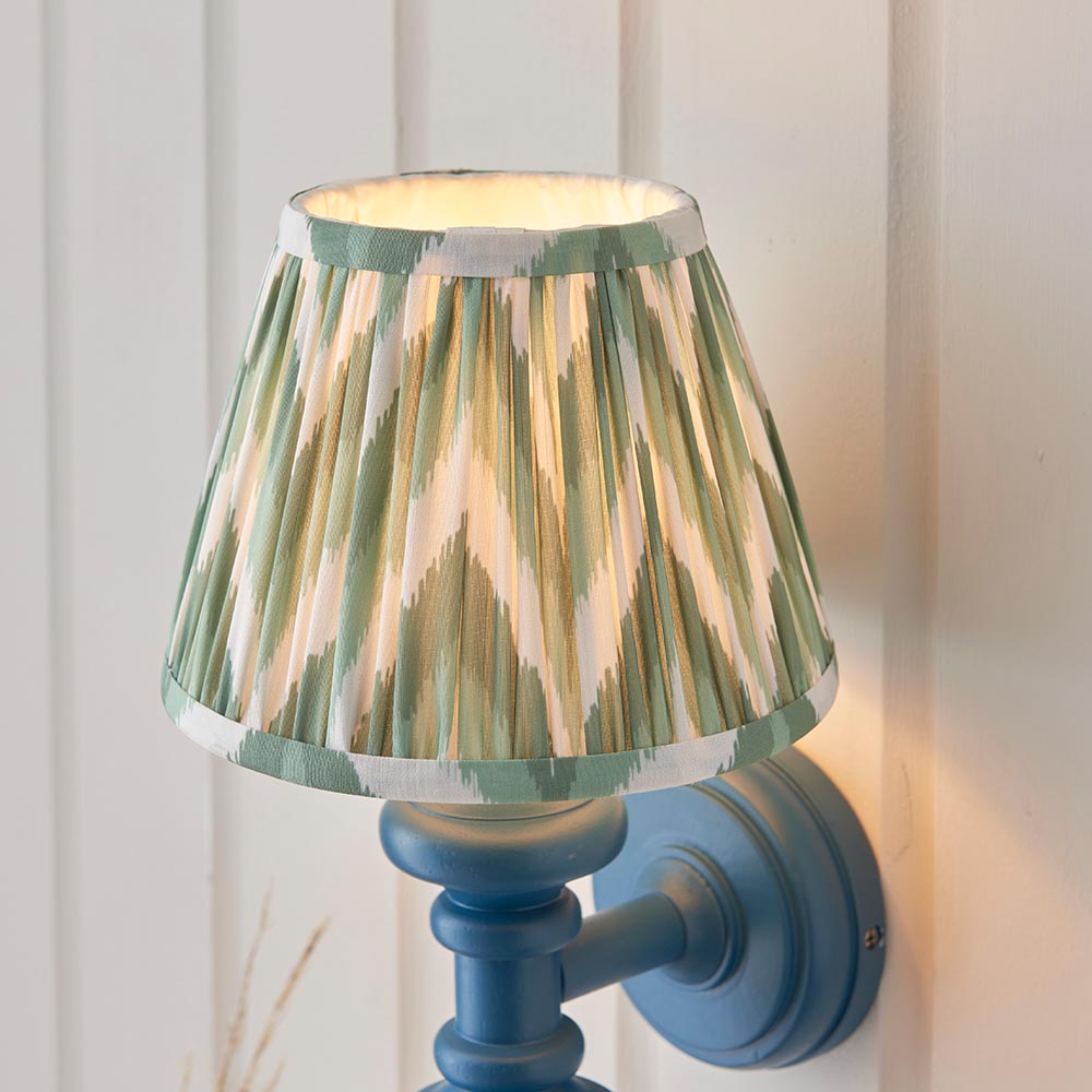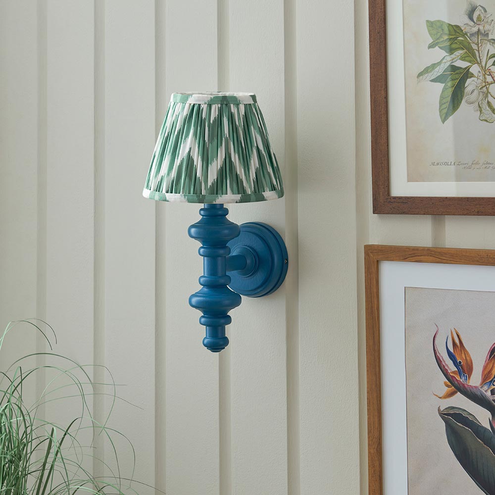 This unique wooden turned spindle wall light is inspired by past design styles with a fresh update. Painted in classic satin marlin blue with a brass B22 lamp holder for that timeless authentic look. Paired with our bold Cotswold green 20cm Zigzag shade for a unique, classic style.