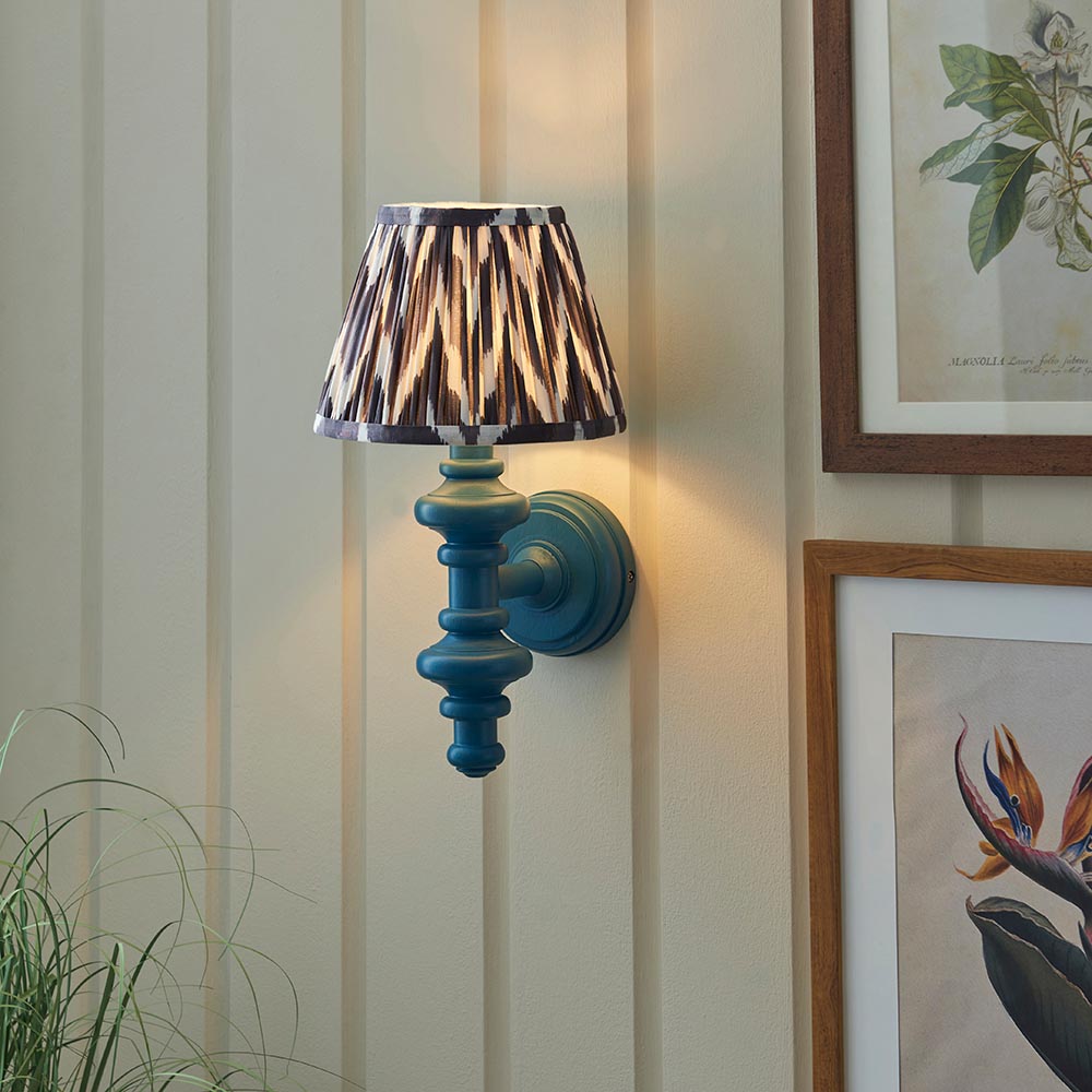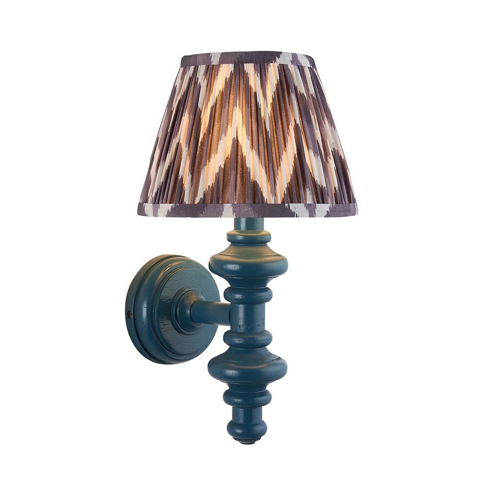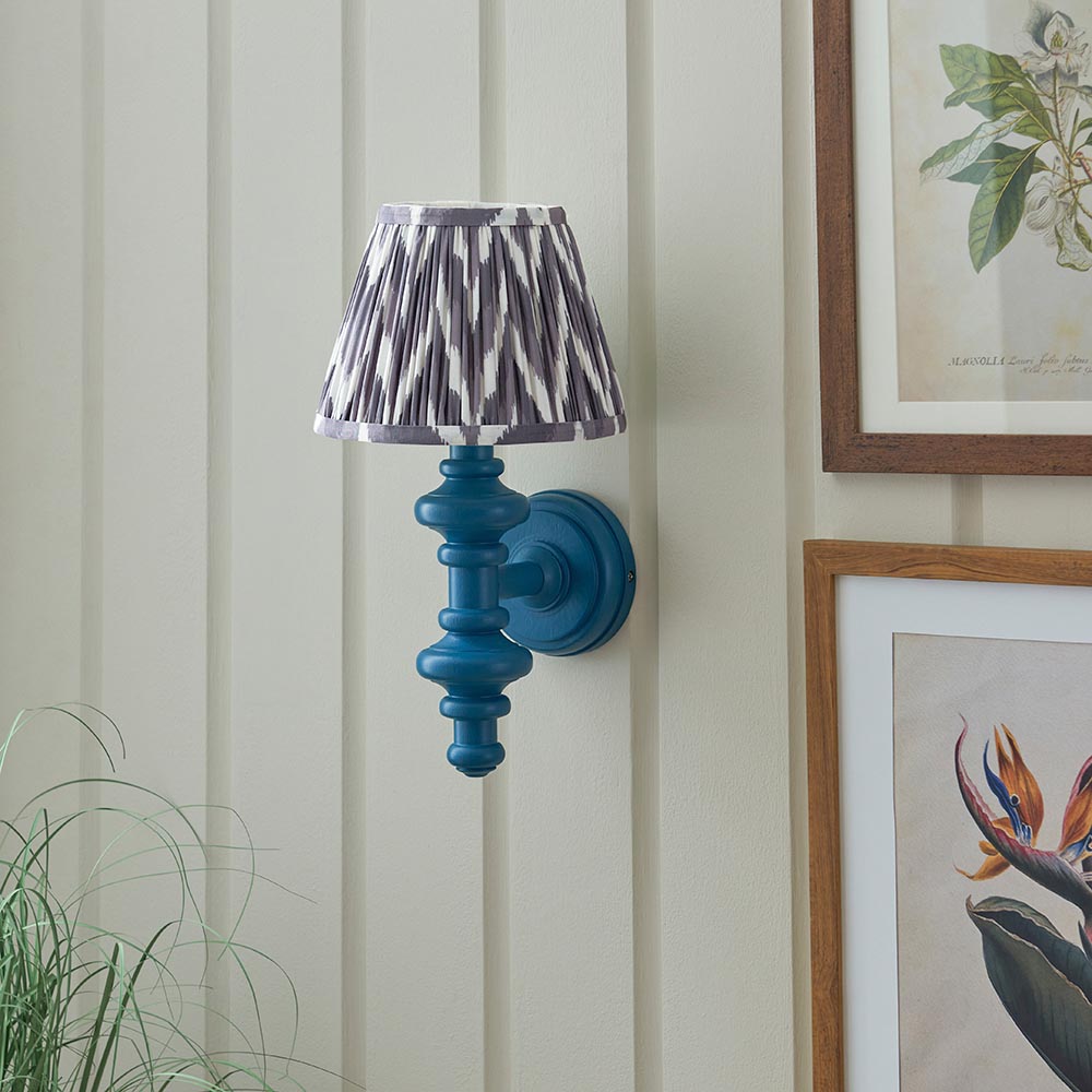 This unique wooden turned spindle wall light is inspired by past design styles with a fresh update. Painted in classic satin marlin blue with a brass B22 lamp holder for that timeless authentic look. Paired with our stylish pearl grey 20cm Zigzag shade for a unique, classic style.