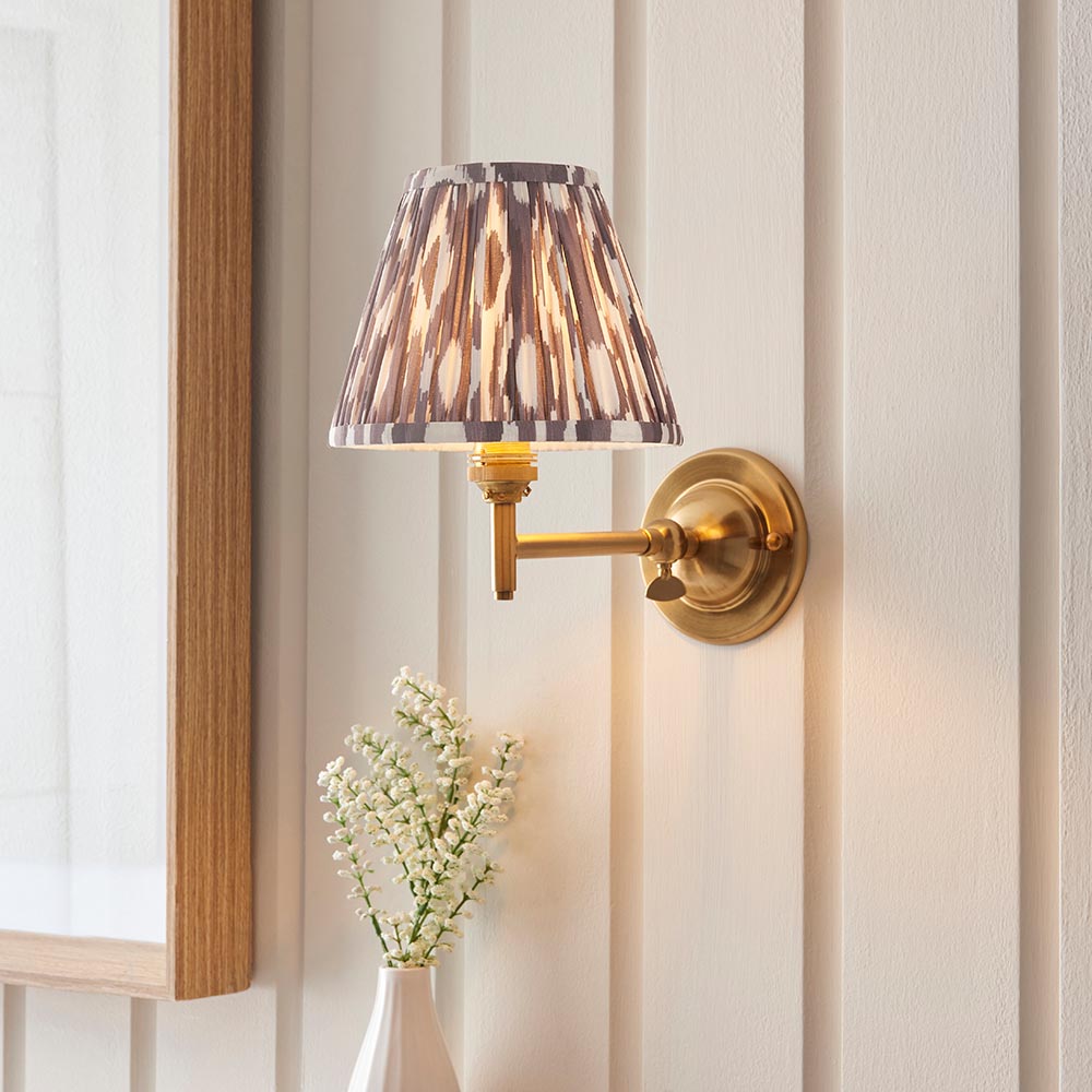 An ageless dome shaped wall light with a simple linear arm, featuring an adjustable knuckle to fold and reposition the light. Perfect for bedsides, finished in brushed aged brass and completed with our stylish pearl grey 16cm Ikat shade.