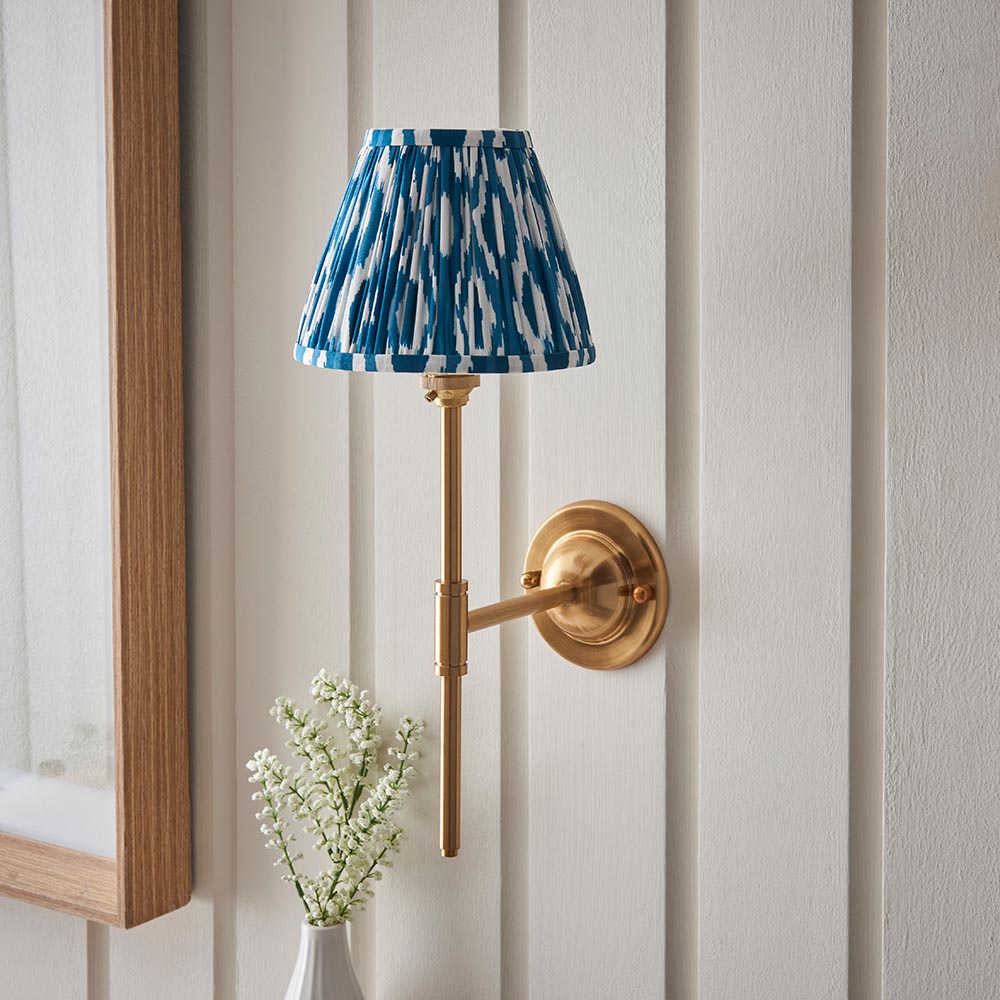 A classic and understated wall light featuring a dome shaped wall back with an elegant linear arm. Perfect for many areas of your home, finished in brushed aged brass; paired with our vibrant marlin blue 16cm Ikat shade for a classic look.