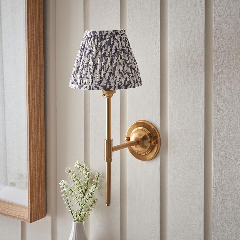 A classic and understated wall light featuring a dome shaped wall back with an elegant linear arm. Perfect for many areas of your home, finished in brushed aged brass; paired with our subtle pearl grey 16cm Leaf shade for a classic look.