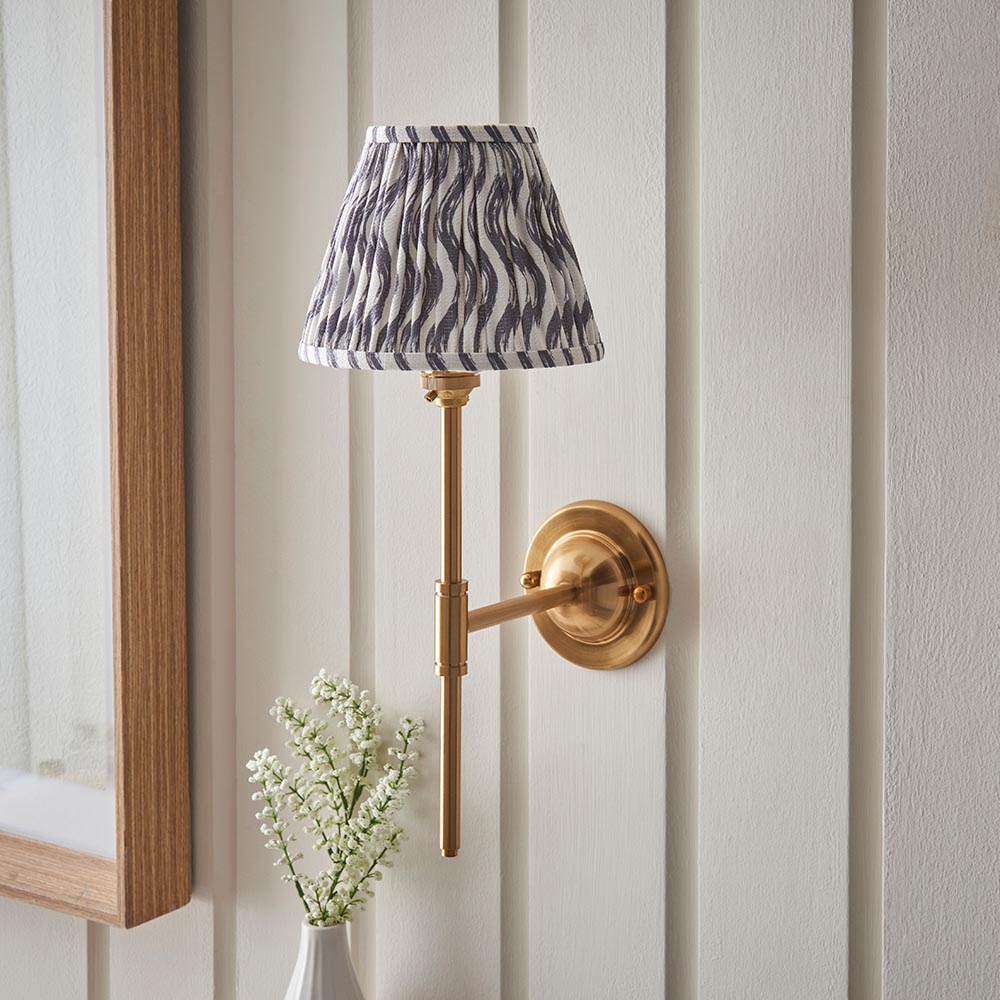 A classic and understated wall light featuring a dome shaped wall back with an elegant linear arm. Perfect for many areas of your home, finished in brushed aged brass; paired with our stylish pearl grey 16cm Ripple shade for a classic look.
