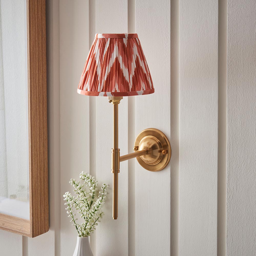 A classic and understated wall light featuring a dome shaped wall back with an elegant linear arm. Perfect for many areas of your home, finished in brushed aged brass; paired with our bright apricot orange 16cm Zigzag shade for a classic look.