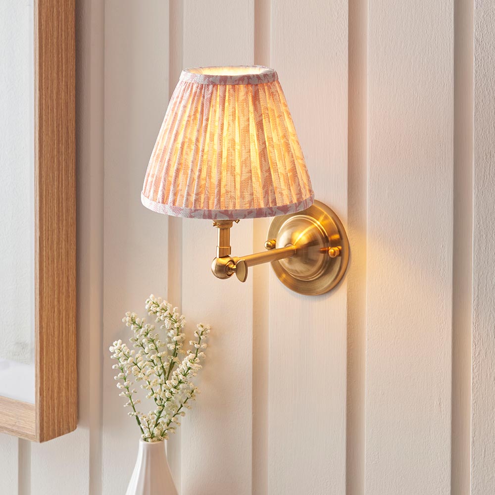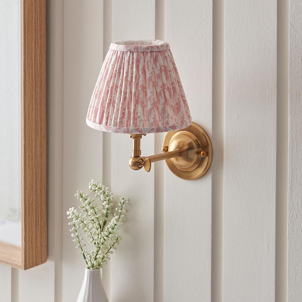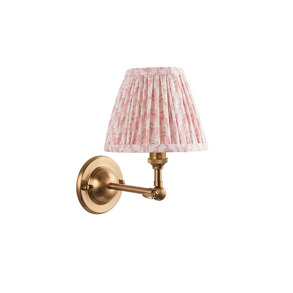 An ageless dome shaped wall light with simple linear arm featuring an adjustable knuckle to angle the wall light for that authentic classic look. Perfect for bedsides, hallways and lounge spaces. Finished in brushed aged brass; completed with our subtle peachy keen 16cm Leaf shade.