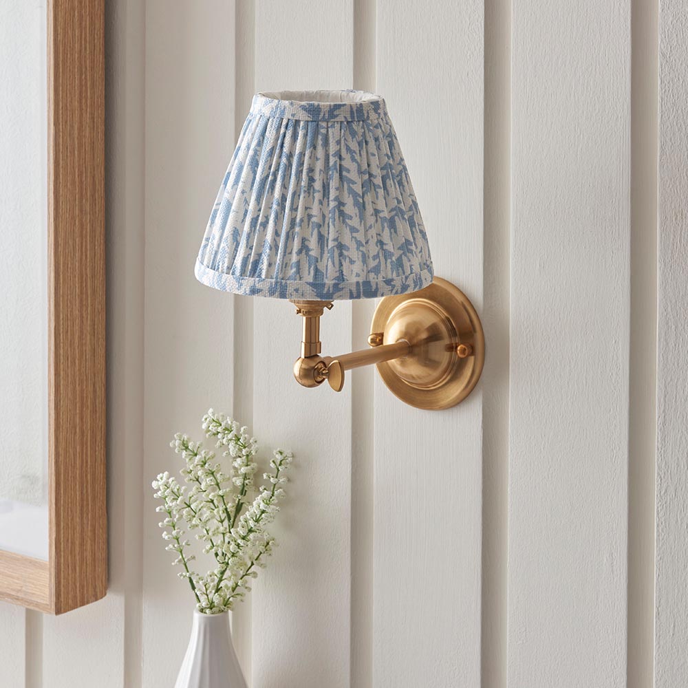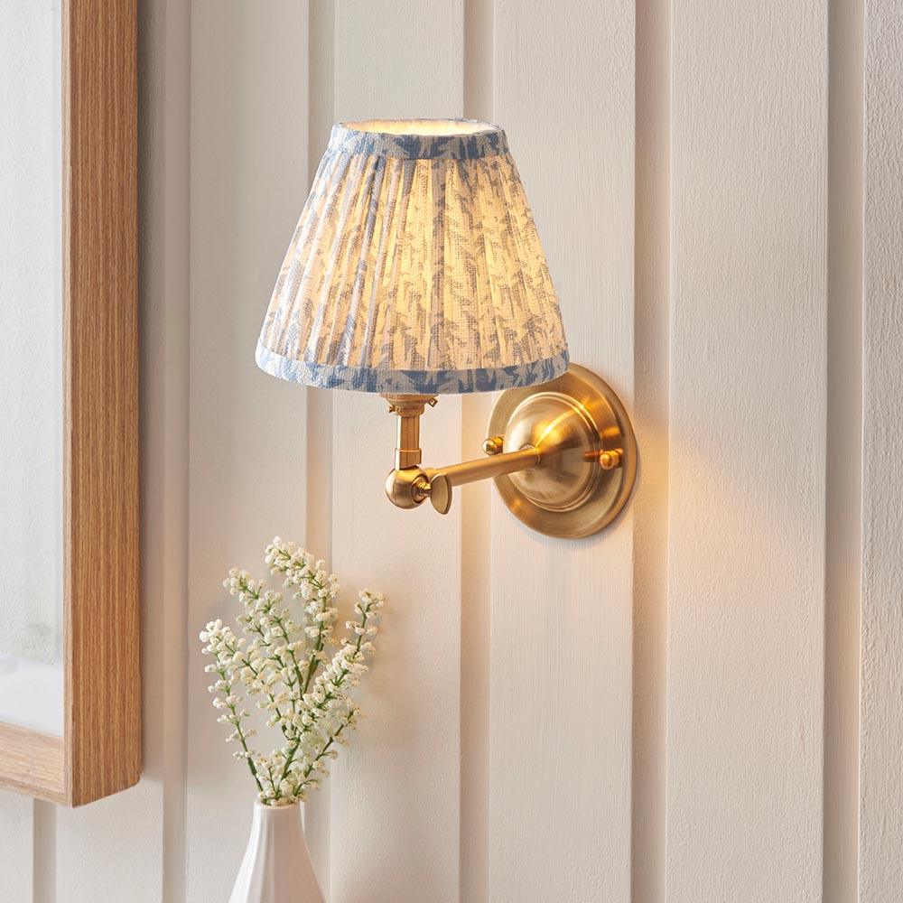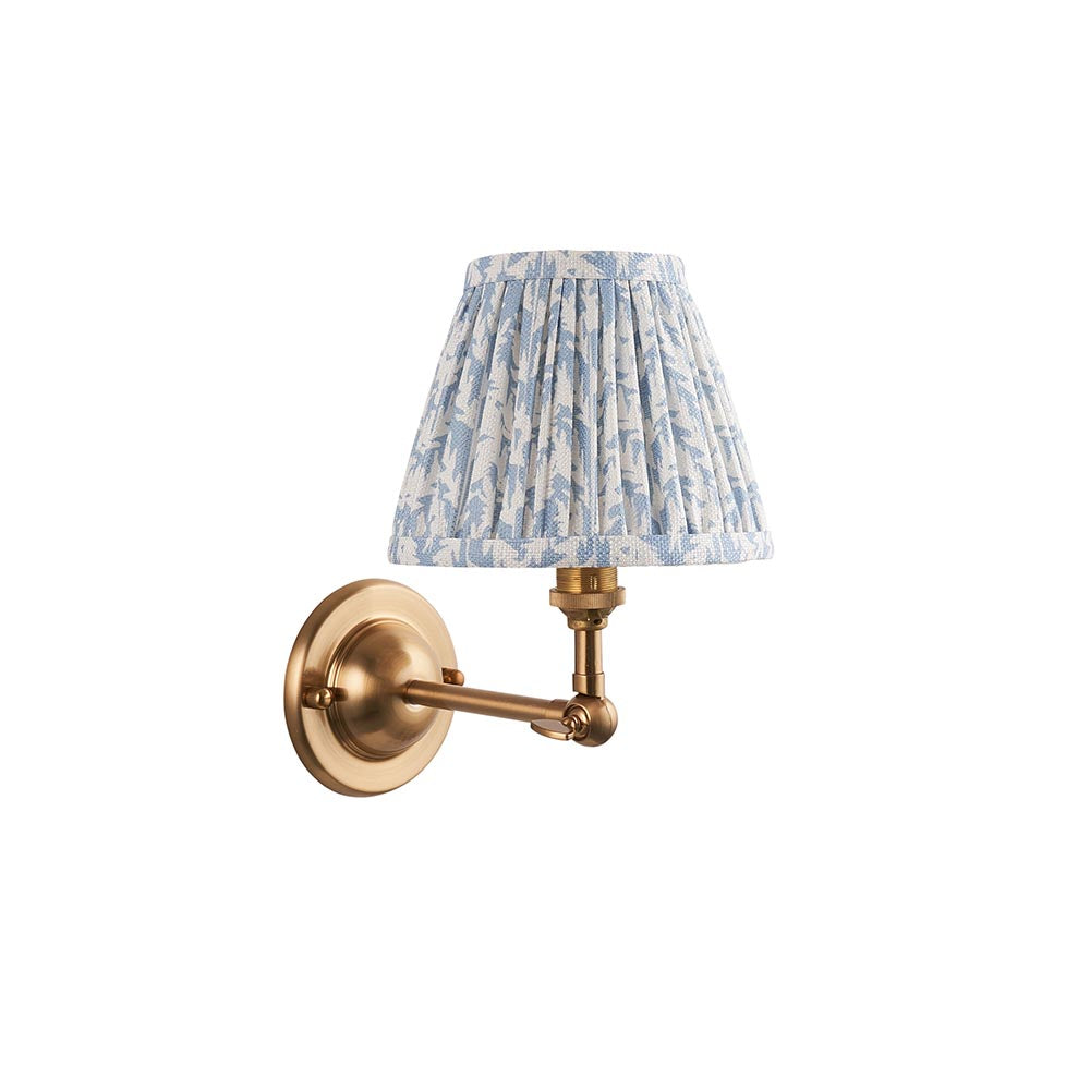 An ageless dome shaped wall light with simple linear arm featuring an adjustable knuckle to angle the wall light for that authentic classic look. Perfect for bedsides, hallways and lounge spaces. Finished in brushed aged brass; completed with our subtle shell bay blue 16cm Leaf shade.