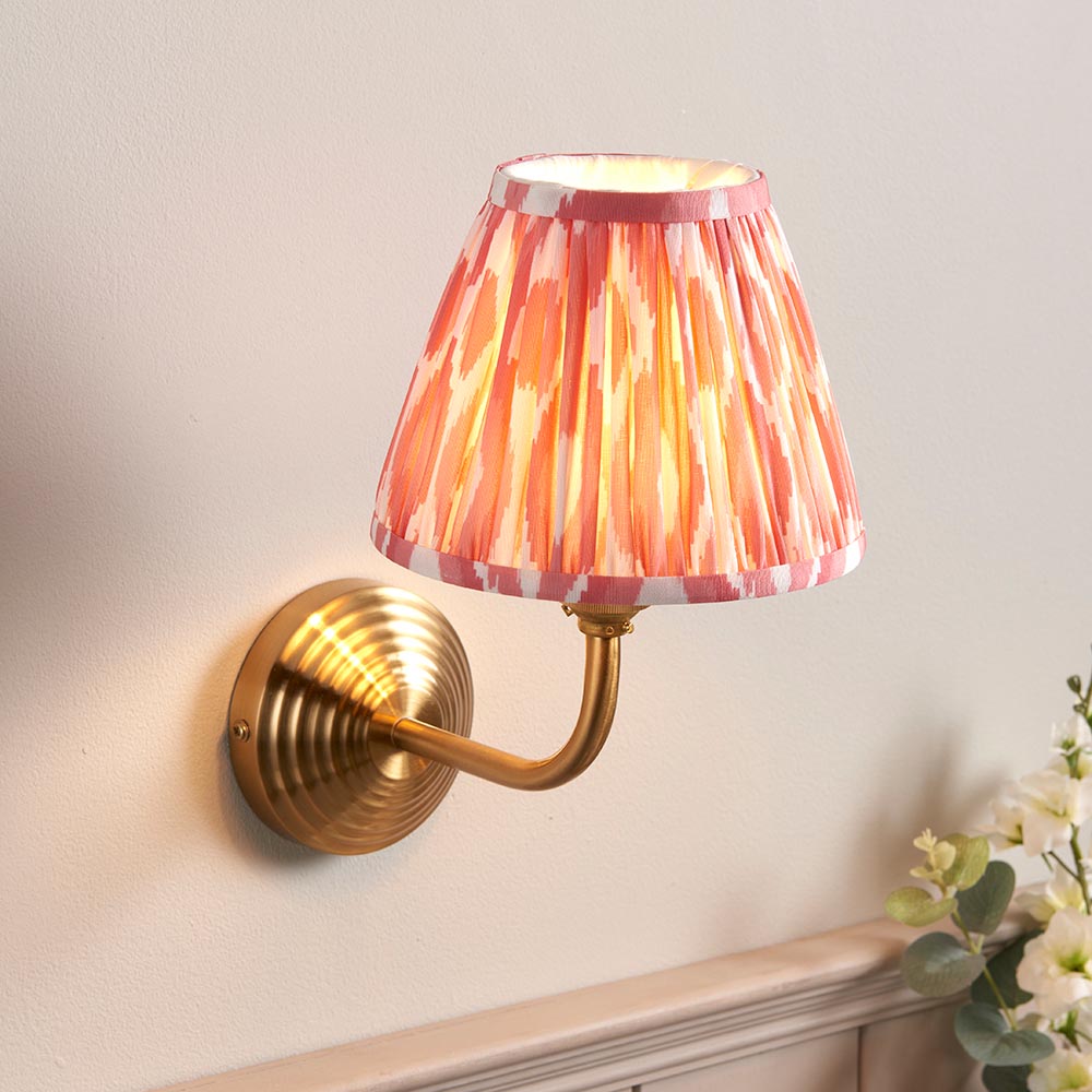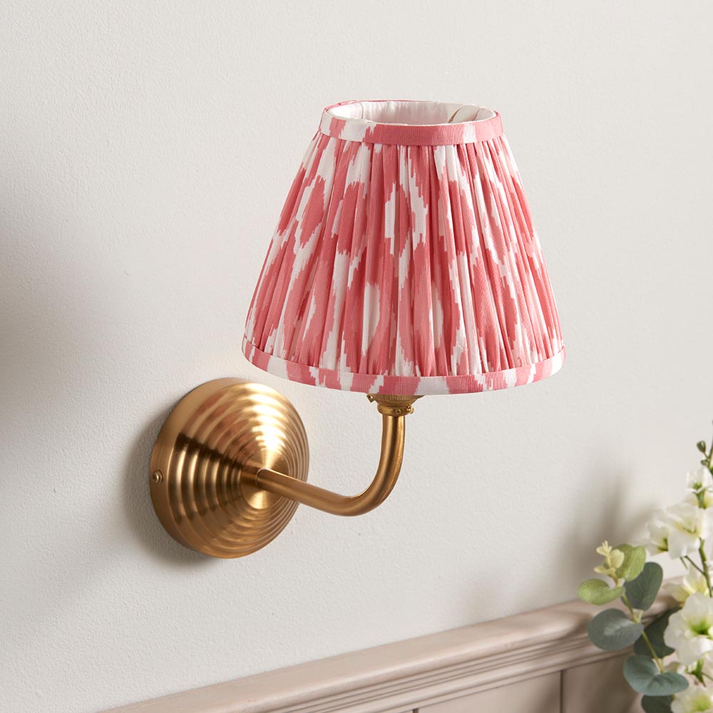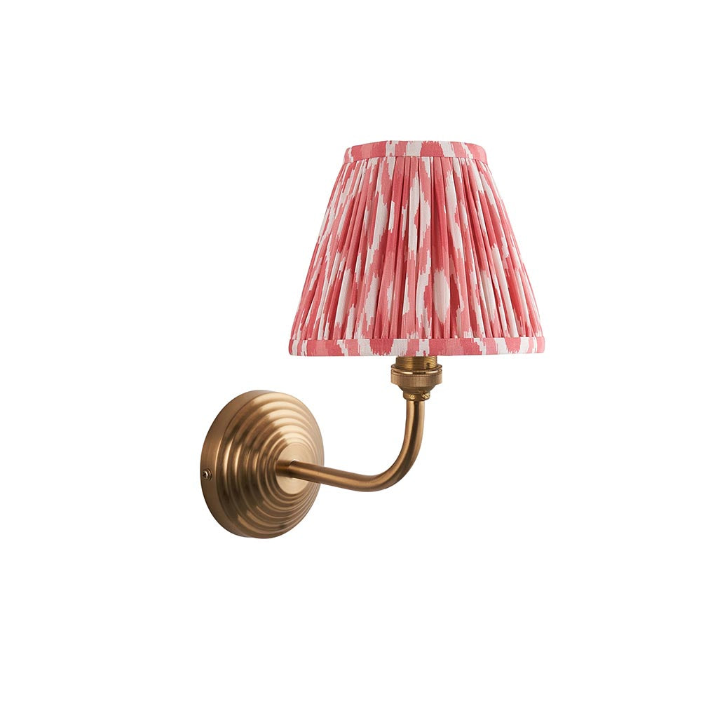 A multiple stepped wall light with a simple curve arm, finished in brushed aged brass. This look is completed with our vibrant coral pink 16cm Ikat shade.