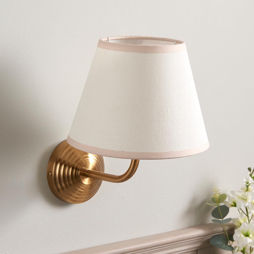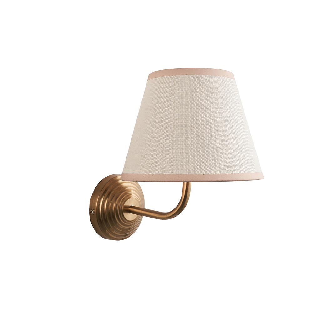 A multiple stepped wall light with a simple curve arm, finished in brushed aged brass. Paired with our vintage & almond white 20cm Ivy shade for a classic look.